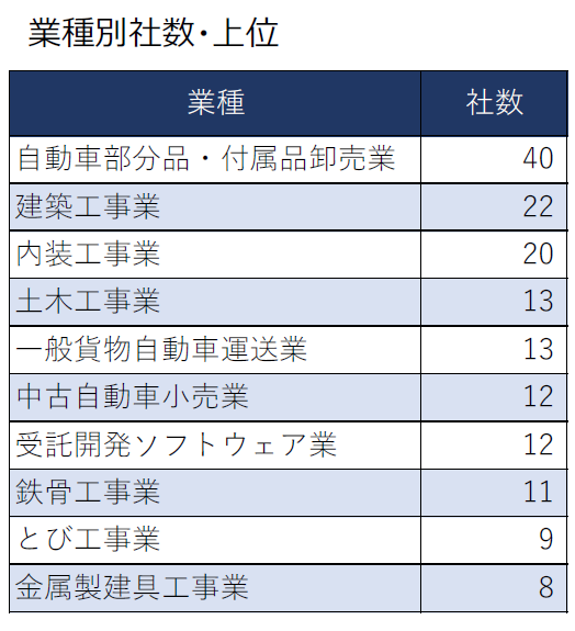 業種では、「自動車部品卸」や店舗建設に関わる「建設業」が上位に。