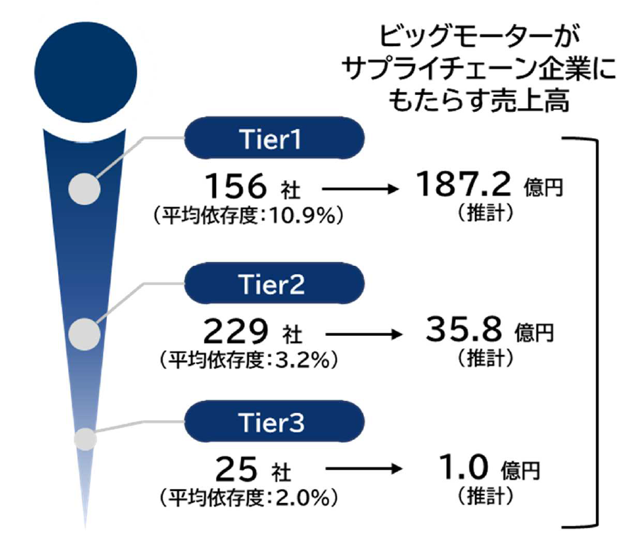 ビッグモーターを頂点としたサプライチェーン企業(売上高の1%以上を依存している企業)は、全国に410社あると推計される。直接取引のあるTier1は156社。間接取引のあるTier2、Tier3はそれぞれ229社、25社