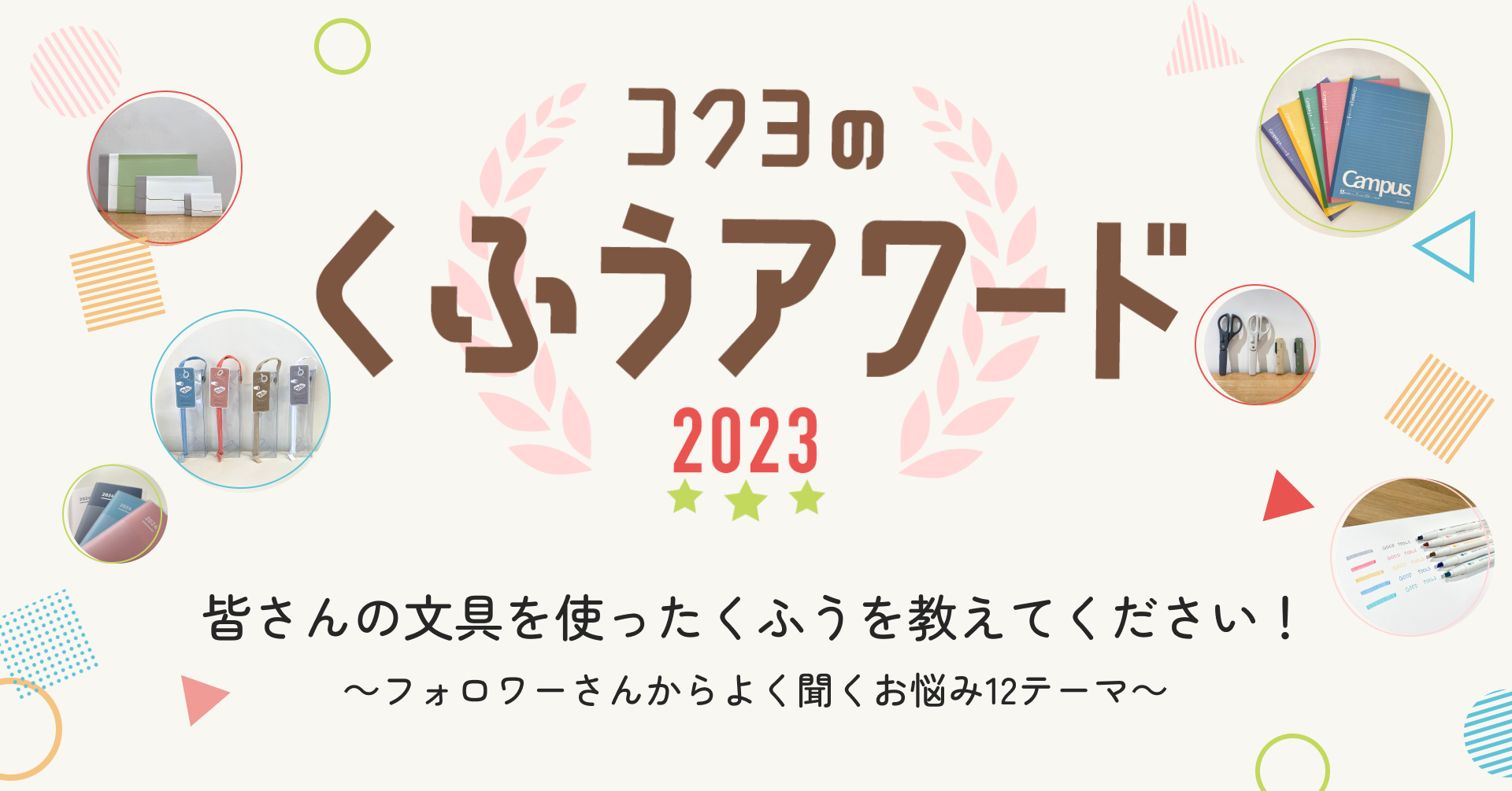 今回、コクヨからの発信にとどまらず、広く一般の方々からも文具を使った「くふう」を募集し、頂いたアイディアをシェアする『コクヨのくふうアワード』を昨年に引き続き開催します。「はたらく」「まなぶ」「くらす」シーンに楽しくポジティブな変化を起こすような「くふう」を集め、頂いたアイディアを『コクヨのくふう研究室』HPやコクヨ公式SNSにてシェアするほか、12月に開催予定の『コクヨのくふうフェス2023』にて紹介をします。さらに、優れた「くふう」を選出し、同イベント内で表彰式も実施します。