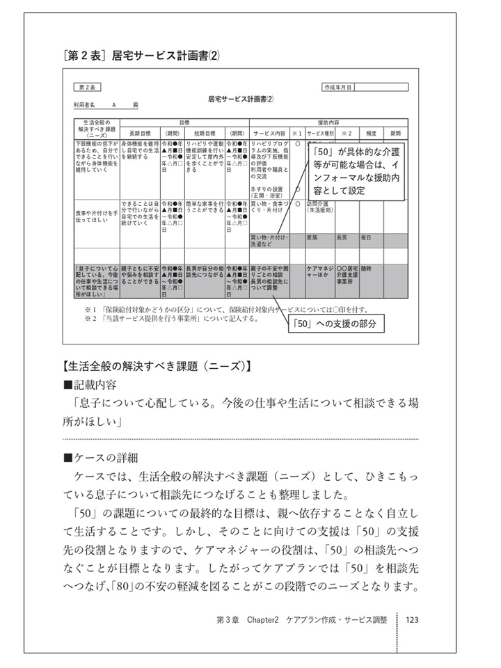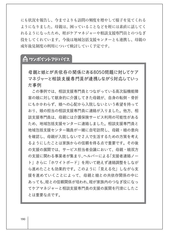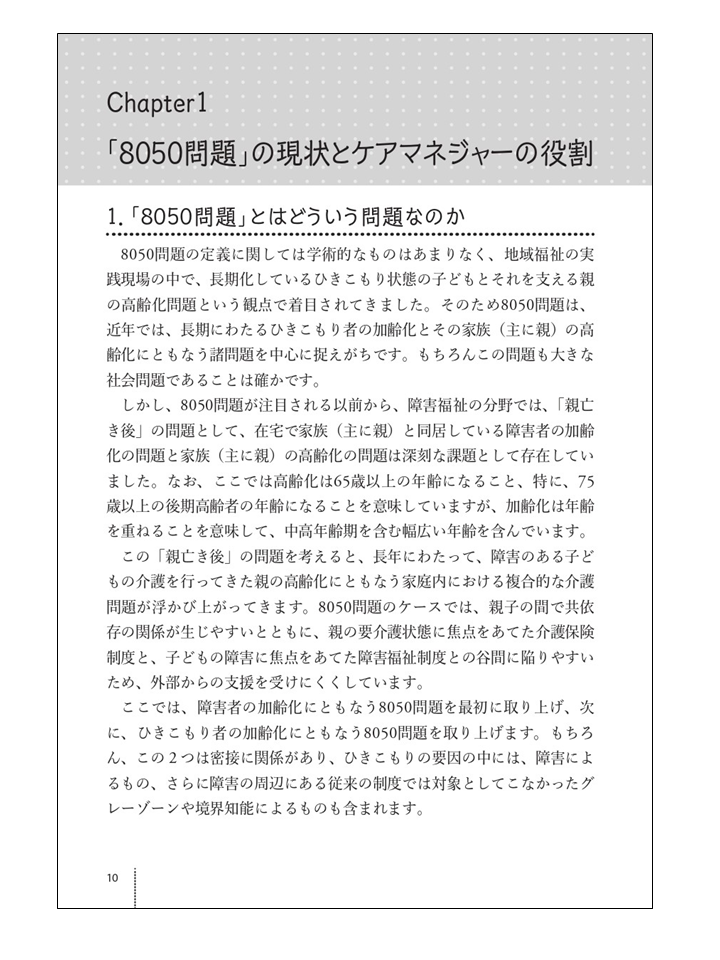 「解説編」では「8050問題」の全体像や支援において必須となる他の社会資源との連携について解説し、ケアマネジメントプロセス毎に支援する際の留意点や、対応のポイントを丁寧にまとめました。