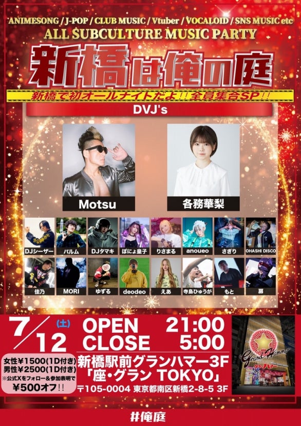 サブカルチャーをテーマにした週末オールナイト DJ イベント『新橋は俺の庭〜週末オールナイト回だよ!全員集合 SP!!〜』が2025 年 7 月 12 日(土)に開催!