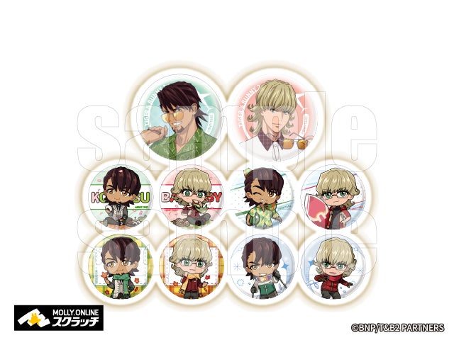 鏑木・T・虎徹、バーナビー・ブルックス Jr.がバケーションスタイルになった姿のイラストや、お花見やビーチ、紅葉、スキーと四季の行楽シーズンを楽しんでいるデフォルメスタイルの描き起こしイラストをあしらった缶バッジ。