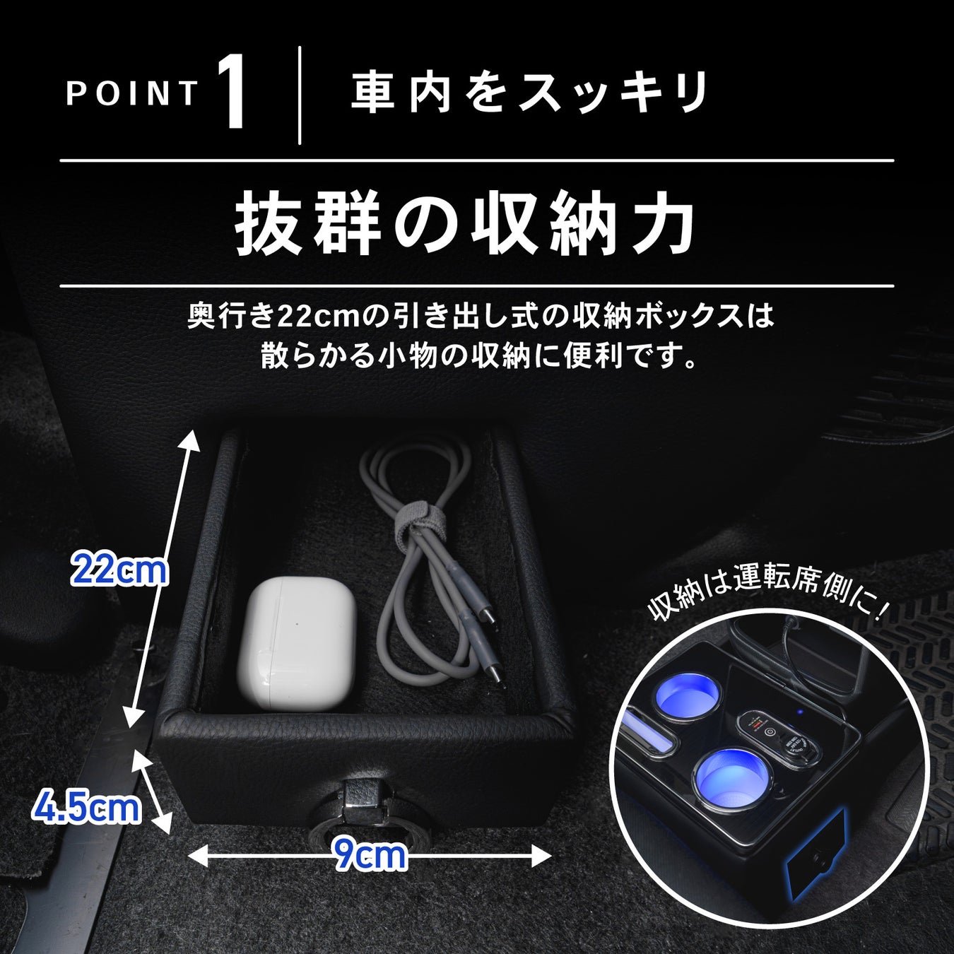 初代N-BOXJF1 JF2専用 LEDコンソールボックス。タイプA、タイプCシガーソケットを完備。夜も安心のLED搭載。引き出し式の収納ボックスは散らかりを一瞬で解決!
