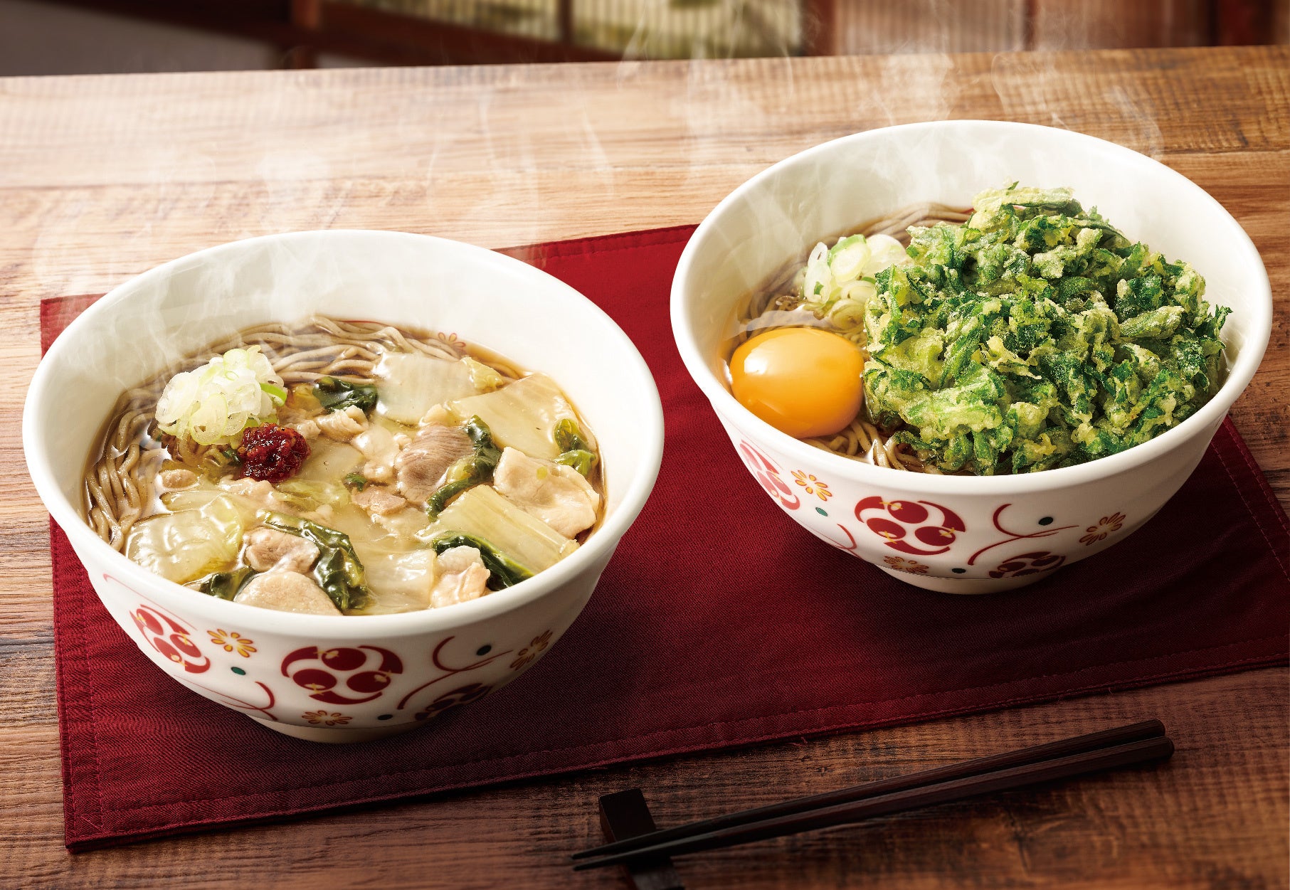 83店舗展開中の駅そばブランド「いろり庵きらく」で季節の人気商品「豚肉白菜あんかけそば」「春菊天玉そば」