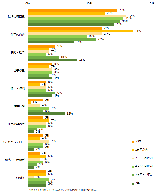 退職原因別で見ると、「1ヵ月以内」に退職した方は「仕事の内容」にギャップを感じた方が多いことが分かります。「時給・給与」、「残業時間」を退職理由に挙げる方は、就業期間「2年以上」に多いことが分かりました。