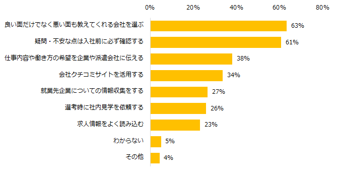 ギャップのない就業をするために有効だと思うのはどんなことか伺うと、上位は「良い面だけでなく悪い面も教えてくれる会社を選ぶ」(63%)、「疑問・不安な点は入社前に必ず確認する」(61%)でした。入社後に「良いギャップ」「うれしいギャップ」を感じた経験がある方のエピソードも紹介します。