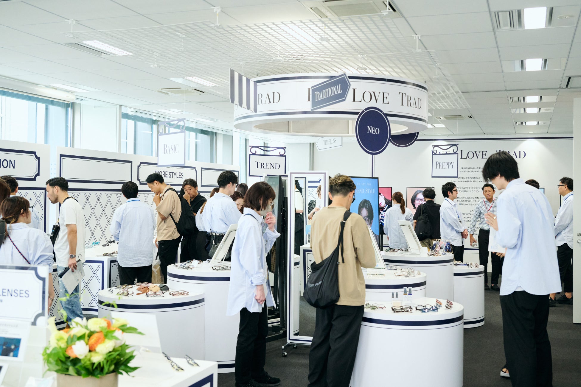 本展示会では、“EYE LOVE TRAD”をテーマに時を越えて愛され続けるファッションのようにタイムレスでも旬を感じられる、新しいスタンダートとなるメガネを提案。シルエット、デザイン、スタイリングなどからメガネを選ぶ楽しさを広げられるように、「TREND STYLE」「PREPPIE STYLE」「BASIC STYLE」の3種類の商品を秋冬のスタイリングに合わせて計150種を展開しました。