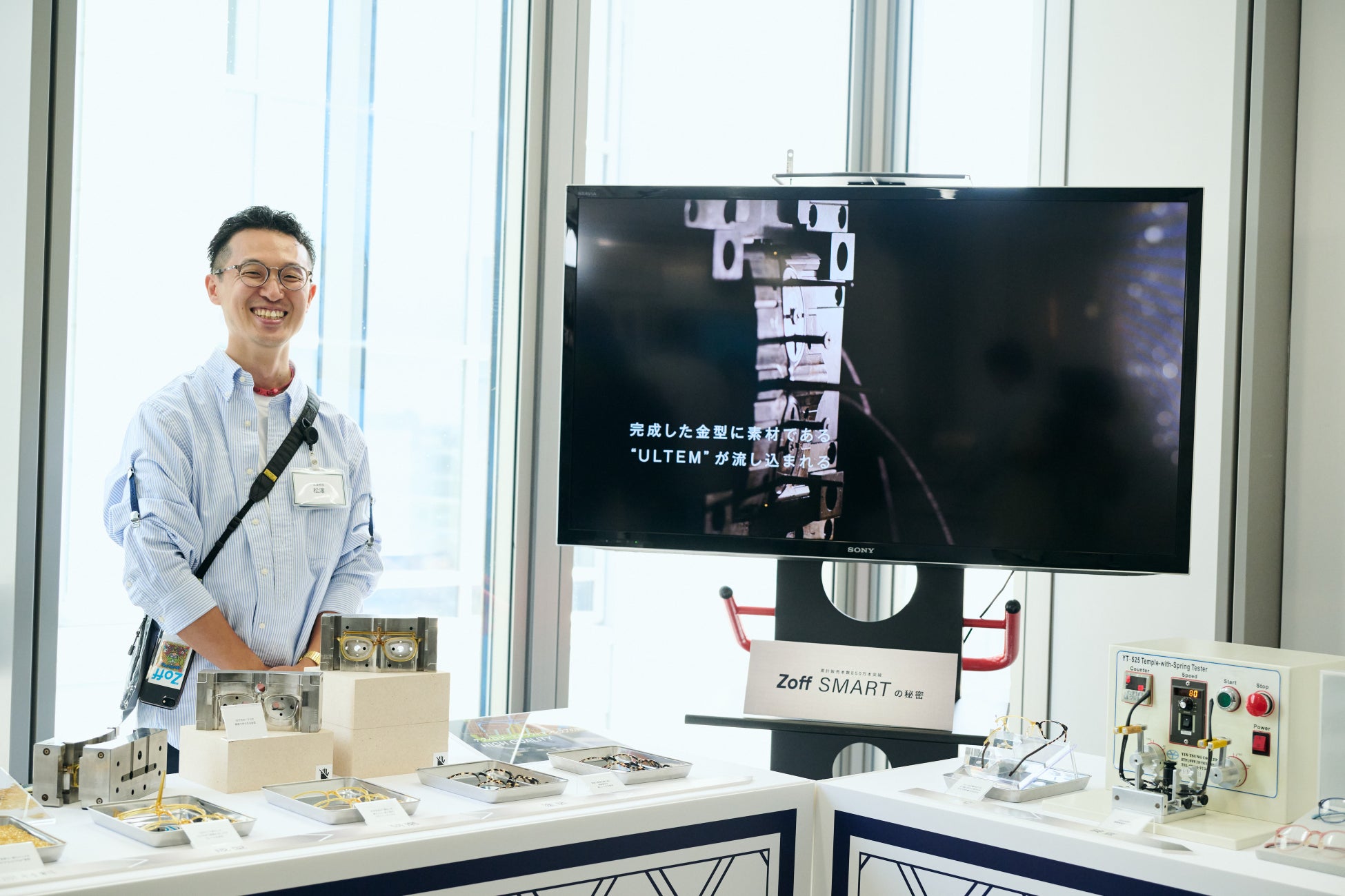 さらに、累計販売本数850万本以上の「Zoff SMART」のコーナーは、普段見られる機会の少ない特殊な金型を工場より取り寄せ、原材料から商品として形になるまでの“モノづくり”を体感できる展示となりました。また、秋冬に適したレンズとして、くもり止めレンズや8月下旬発売予定のプレミアムスーパーハードコート、紫外線100%カットの新色調光レンズなどを展示しました。