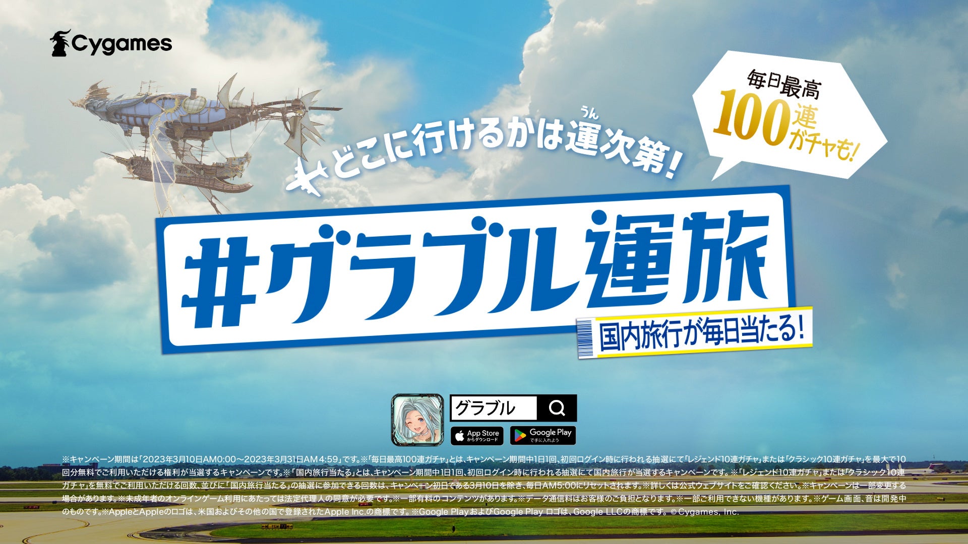 ゲームの企画・開発・運営事業を展開する株式会社Cygames(以下サイゲームス、本社:東京都渋谷区、代表取締役社長:渡邊耕一)は、サイゲームスの子会社である、デザイン制作・ゲーム企画事業を展開する株式会社CyDesignation(以下、サイデザイネイション、本社:東京都渋谷区、代表取締役社長:皆葉英夫)との共同制作によるソーシャルゲーム『グランブルーファンタジー』(以下、グラブル)が、2023年3月10日(金)でサービス開始から9周年を迎えることを記念して、同日0:00より抽選で国内旅行が当たるキャンペーンを開催することをお知らせいたします。