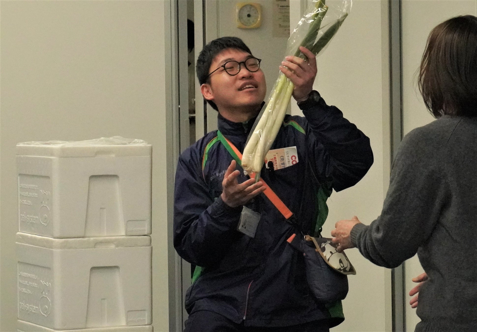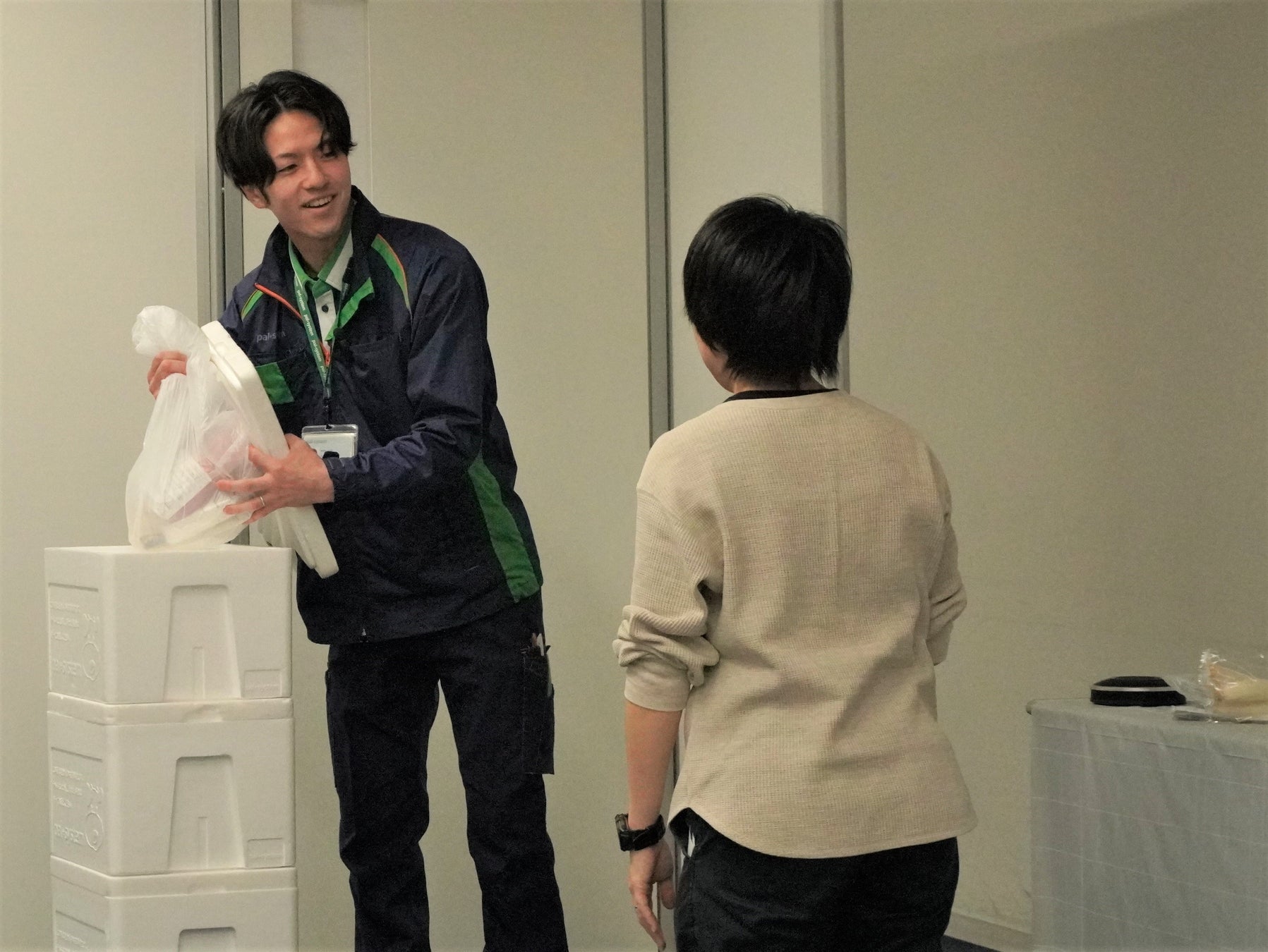 利用者への接遇力を披露したのは、配達を始めて7か月から12年目までの幅広い経歴の職員19人です。会場内に設けた「玄関先」で、利用者役との商品の受け渡しや質問への対応が審査されました。訪問時の声かけからドアを閉めるまでの「所作とあいさつ」「言葉遣い」「品質」「心配り」「応対力」の5項目を、松野理事長をはじめ5人の役職員が採点しました。