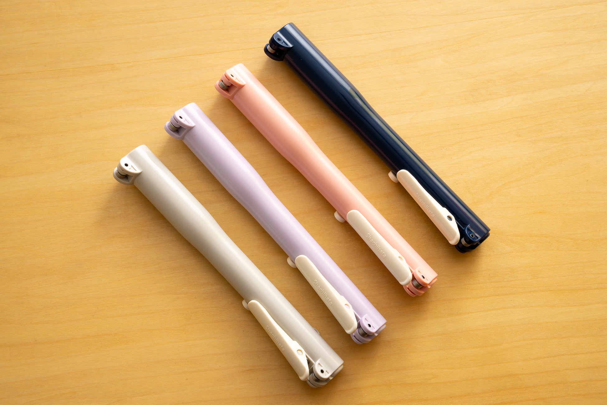 「366日の花ずかん ツインネーム」は、直径9ミリの花個紋はんこと、直径6ミリのオーソドックスな訂正印を1本に収めた2WAY仕様。くすんだ色合いがおしゃれなボディーカラーは(写真右から)ネイビー・ベビーピンク・ラベンダー・ライトグレーの4色から、花個紋のはんこのフォントは3種類から選べます(訂正印のフォントは楷書体となります)。