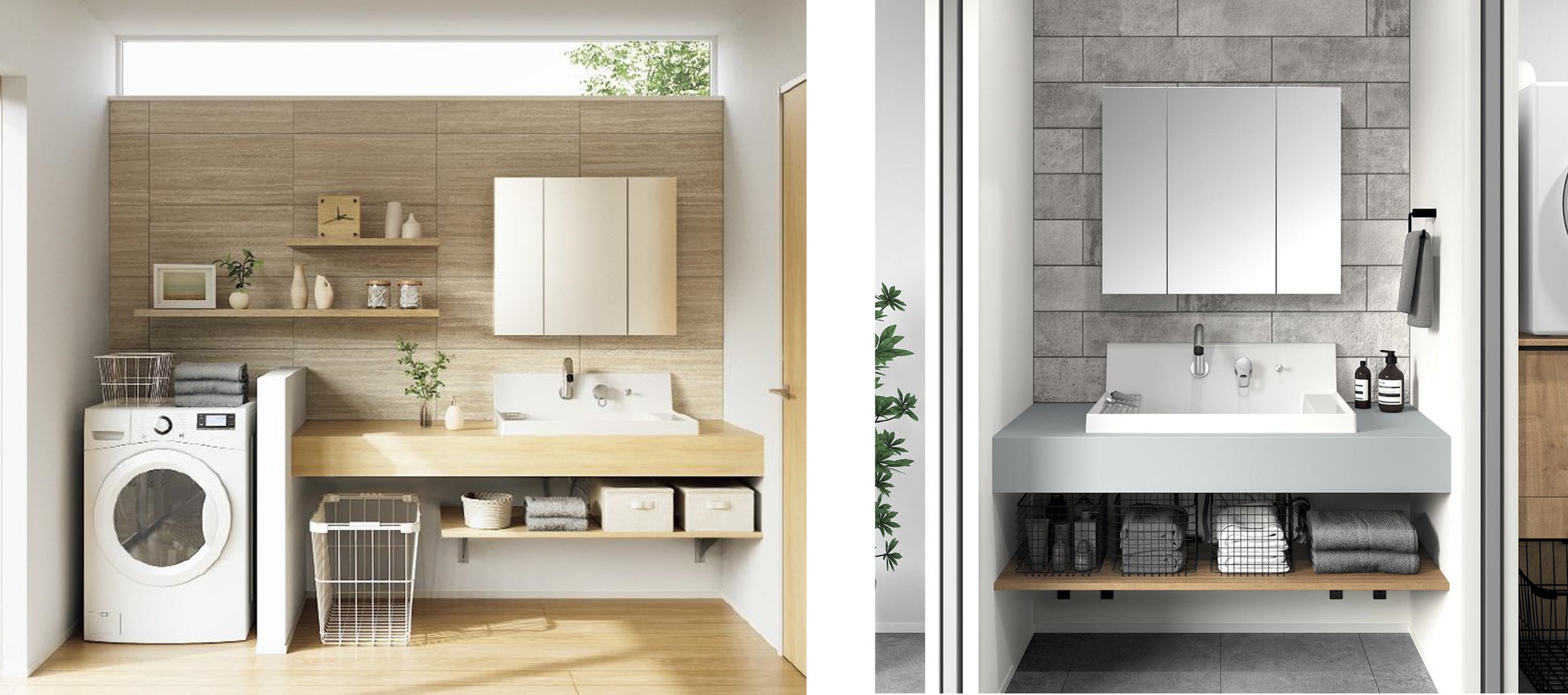 ・アイテム:カウンター、洗面器セット(洗面ボウル、水栓、排水金具)、ランドリーバー、吊り棚、ミラーなどから組み合わせ