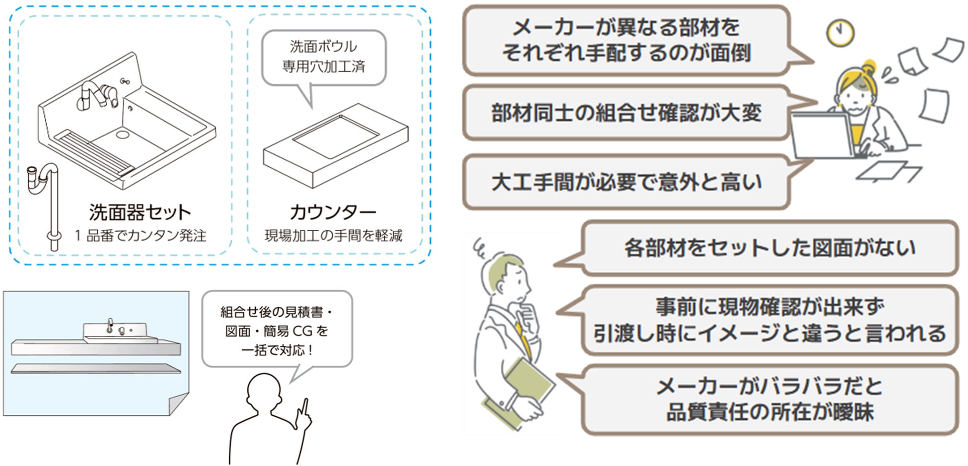人気上昇中の造作洗面ですが、手配が煩わしいなどプロユーザーの悩みが多いのが実情です。「カスタムバニティ」では、見積、提案書、図面、手配まで、一括でまとめて対応することが可能です。これまで負担となっていた各部材の取り合い確認からも解放され、品質保証されるので、安心して商品を提案いただけます。