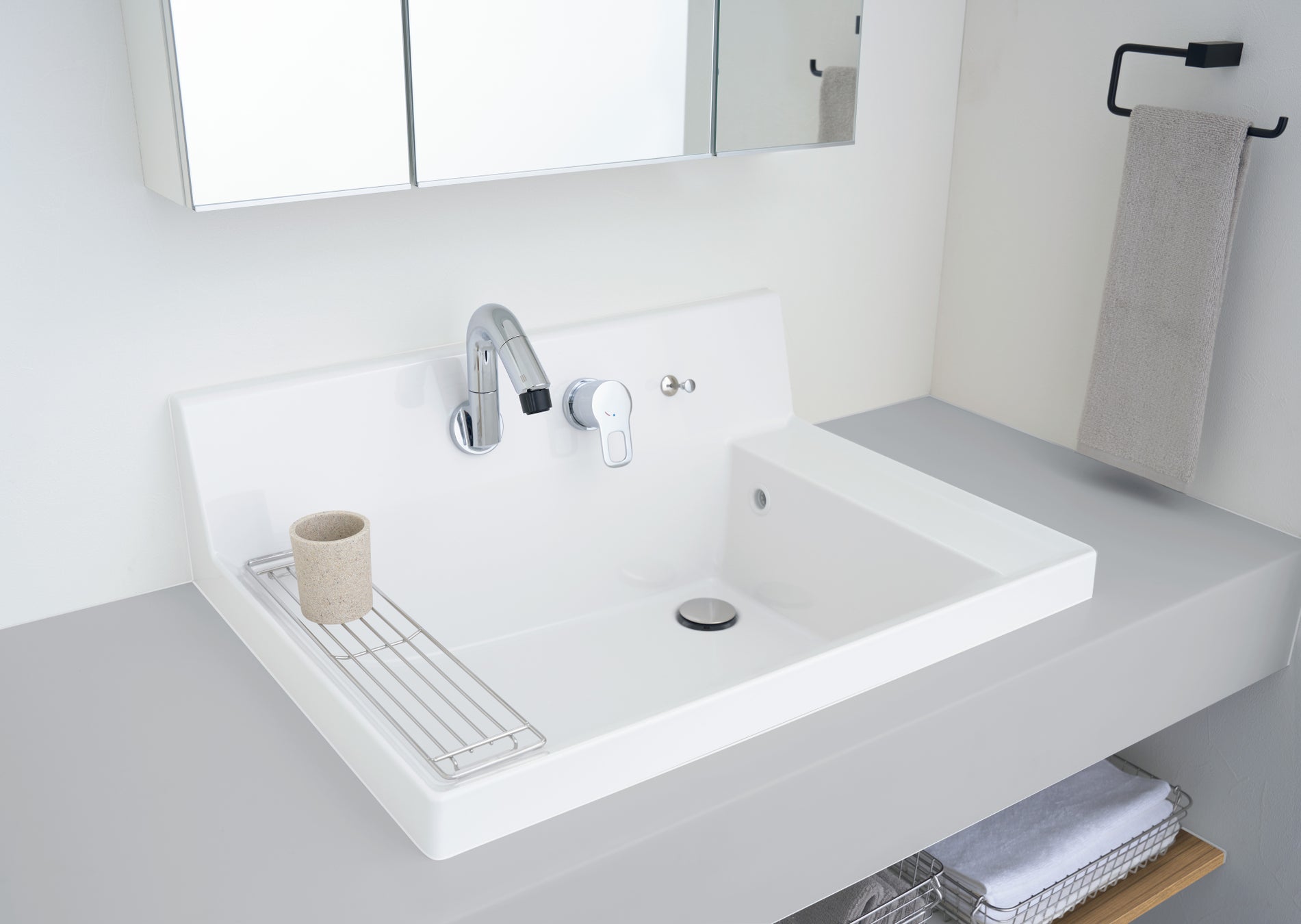 カウンターは11色(※1)から、洗面ボウルは3サイズ3色(※2)から選ぶことが可能です。そして、これまで造作洗面のネックだった機能面については、底が広くて大容量、清掃性の高い洗面ボウルが解決。デザインと機能を兼ね備えた理想の造作風カウンター洗面を叶えることができます。