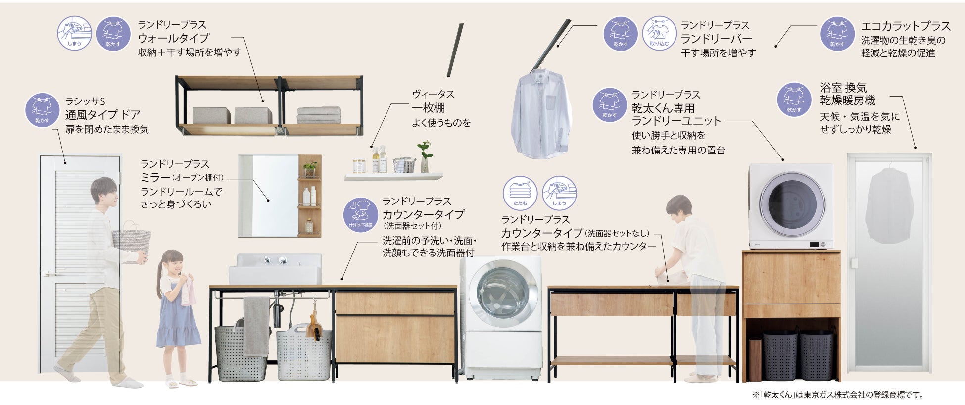 「ランドリープラス」は、スペースの広さや間取り、理想とするイメージに合わせて、スタイリッシュでバリエーション豊かなアイテムを自由に組み合わせ、お好みのランドリー空間を作ることができます。ランドリーこだわり派からの支持が高く、近年注目度が急上昇しているガス衣類乾燥機「乾太くん」の専用ランドリーユニットもご用意しています。(※)