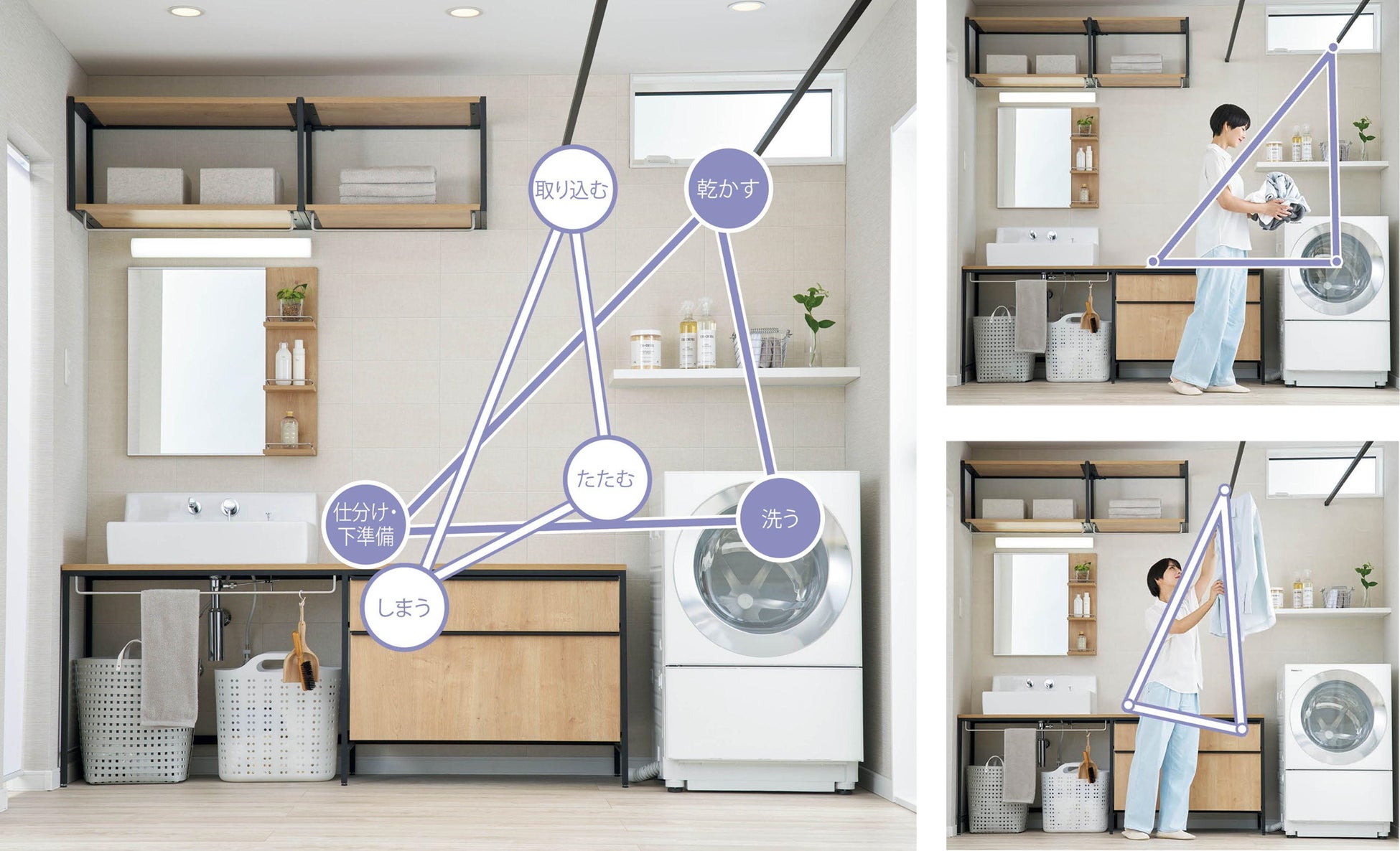 洗濯とは、洗面所にある洗濯機で洗い、ベランダで干し、乾いたらリビングルームに取り込み、たたんでクローゼットにしまう行為。そんな、これまでの洗濯家事の当たり前を変えてみませんか?働き方の多様化やタイパの重要視、花粉や黄砂などの屋外環境への対策として、近年、ランドリー空間への注目が高まっています。LIXILは、洗濯家事の効率化につながる”ダブルトライアングル”という考え方を導き出しました。ポイントは洗濯行為を「洗い」と「片付け」の2工程に分け、工程間の移動を少なくし、その場で完結できること。「ランドリープラス」は、”ダブルトライアングル”をひと部屋で完結し、無駄な手間や動作を省けるランドリー空間です。