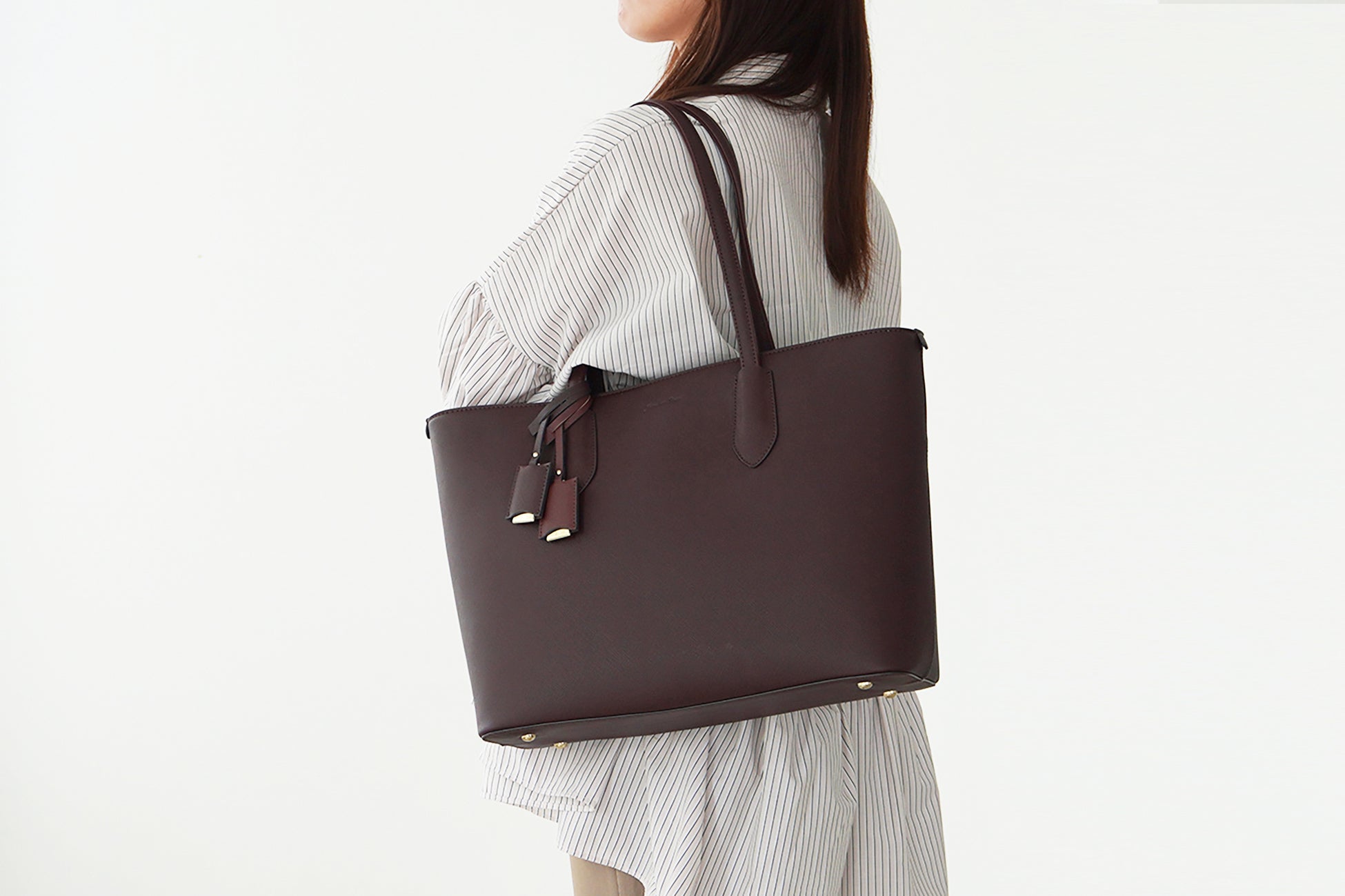 ■シンプルなデザインに、頼れる機能を。きれいめトートに新色バーガンディー登場「リタ トートバッグ」