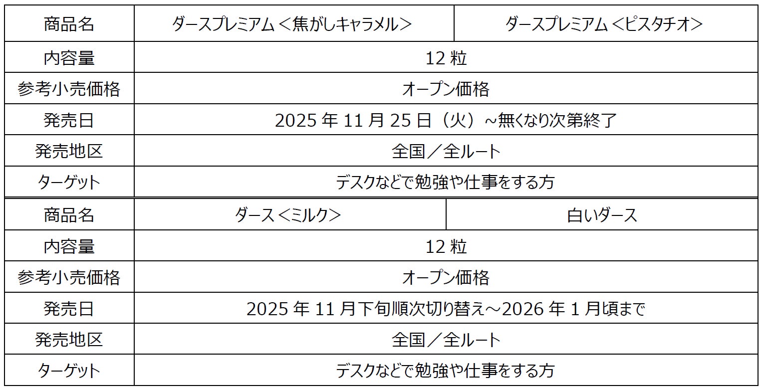 「ダースプレミアム<焦がしキャラメル>」は、焦がしキャラメルとコク深いミルクチョコレートが相性抜群の3層仕立ての「ダース」です。「ダースプレミアム<ピスタチオ>」は、とろけるようなピスタチオの余韻を感じるチョコレートを、クリーミーなホワイトチョコレートで挟みました。
