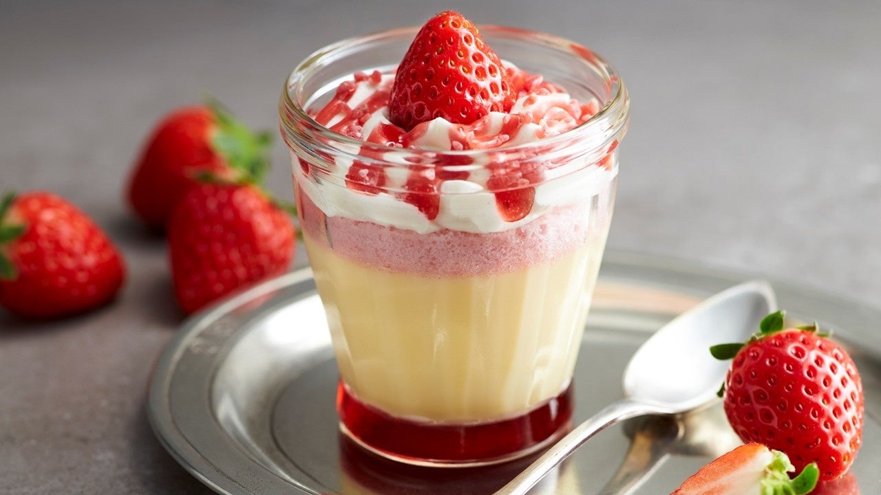 モロゾフの人気の「プリン」と「ストロベリーショートケーキ」の味わいを組み合わせた“ストロベリーショートケーキ”を彷彿とさせる味わいの贅沢な仕立てのプリンパフェ。