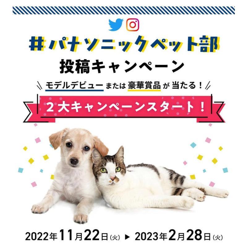 ペットと一緒にパナソニックの家電をご活用いただいているリアルな声を募集します。可愛いおうちのペットとパナソニックの対象家電が一緒に映ったお写真と共に、商品を使用した感想などをハッシュタグをつけてSNSで投稿してください。当選者には『いぬのきもち』『ねこのきもち』でモデルデビュー!