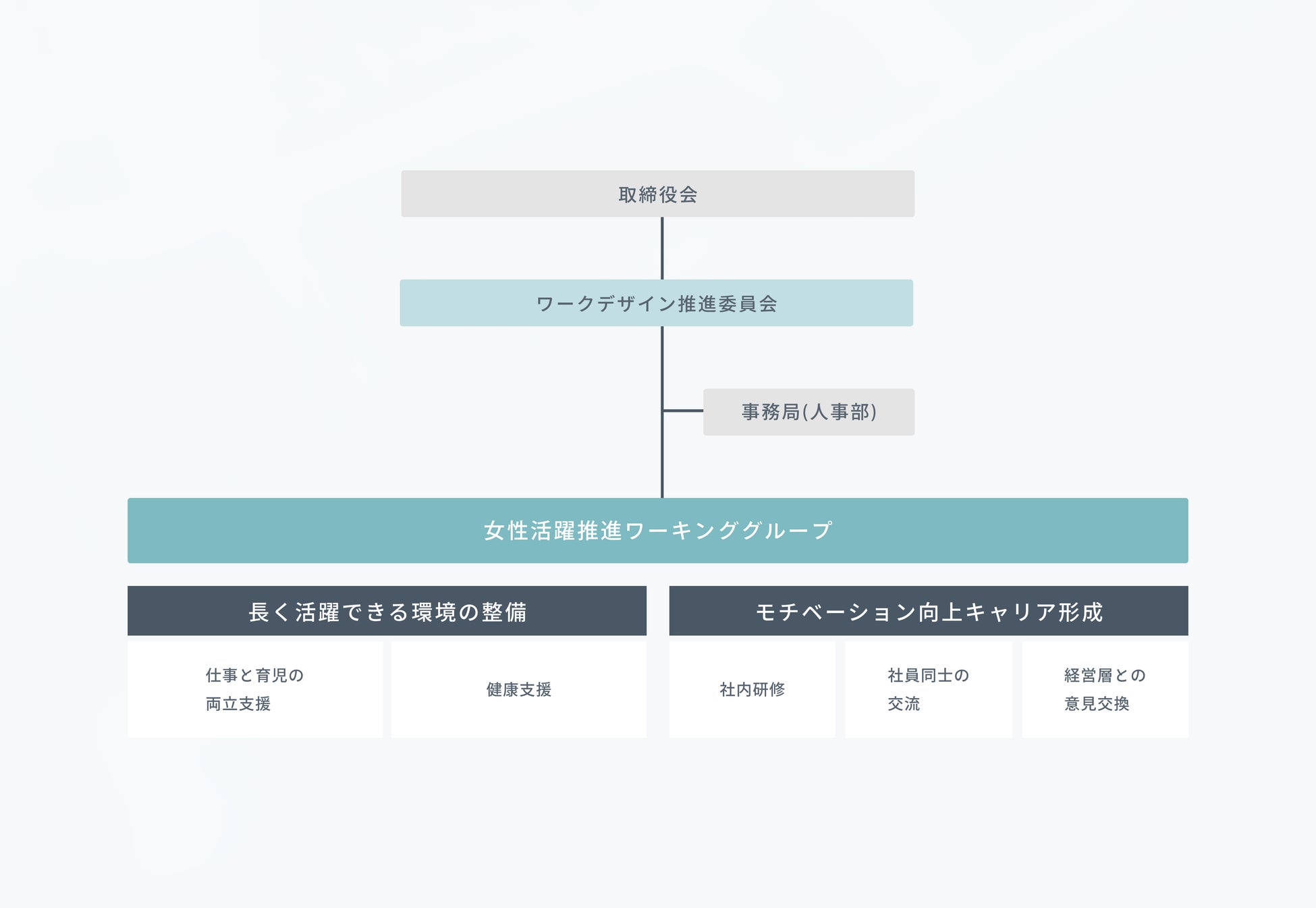 当社では、多様な人材が最大限活躍するための「働き方」を「デザインする」ことを目的とした「ワークデザイン推進委員会」を設置しており、この委員会の分科会として「女性活躍推進ワーキンググループ」を設け、女性活躍を推進していく為の体制を整えています。女性活躍推進ワーキンググループでは、女性が働きやすい環境づくりのための企画立案、サポート、取り組みの実践をしています。また、女性活躍推進の進捗状況及び重要な取り組みについては、取締役会を経て経営層に定期的に報告されます。