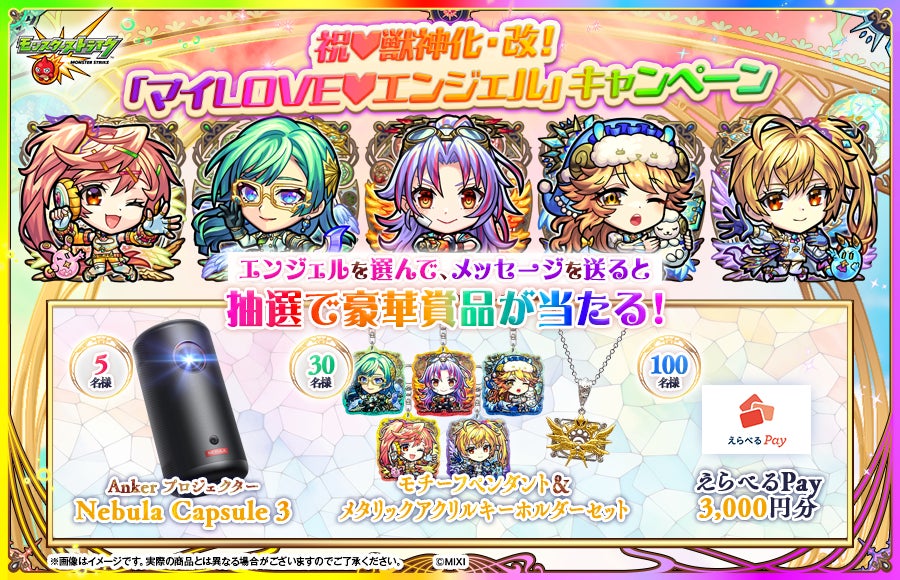 天使シリーズ第2世代の獣神化・改を記念したキャンペーンを開催。好きなキャラクターを選んでメッセージを入力し、生成されたオリジナル画像をXに投稿すると、抽選で「プロジェクター」などの豪華賞品が当たります。