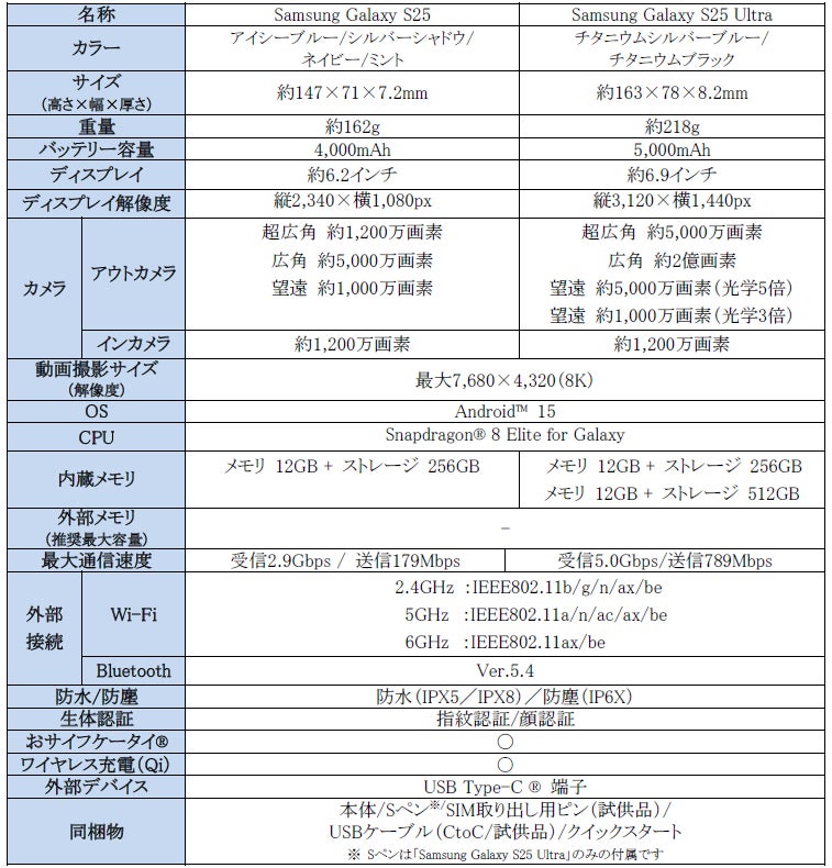 <主な仕様:「Samsung Galaxy S25」、「Samsung Galaxy S25 Ultra」>