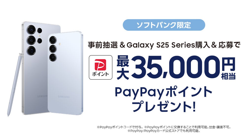購入前にキャンペーンサイトでガチャを回し、対象期間(終了日未定)内にソフトバンクで「Samsung Galaxy S25シリーズ」を購入の上、キャンペーンサイトでご応募された方全員に、最大35,000円相当のPayPayポイント※がもらえる「Samsung Galaxy S25 Seriesをご購入でPayPayポイントがもらえるキャンペーン」を実施いたします。詳細は下記サイトをご確認ください。