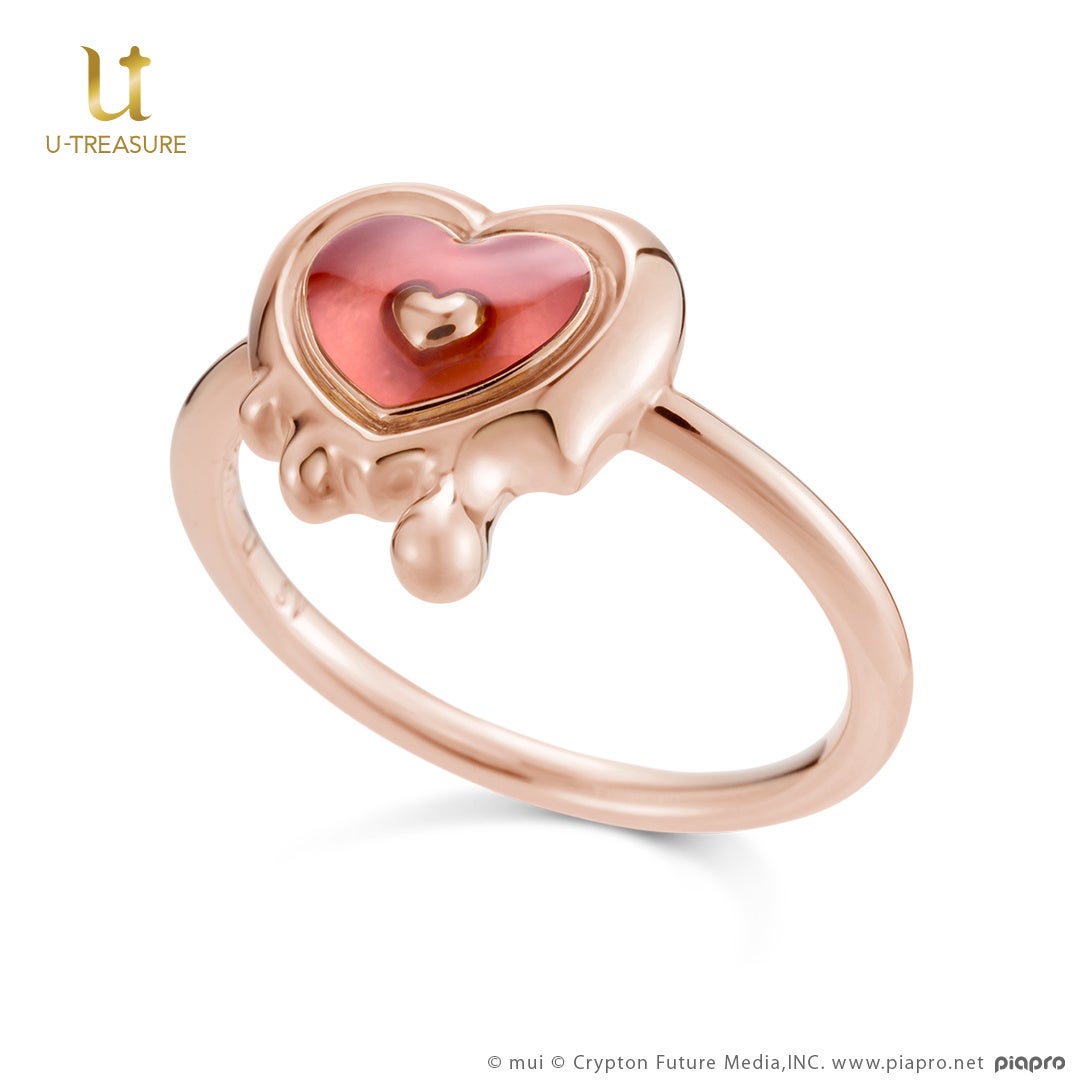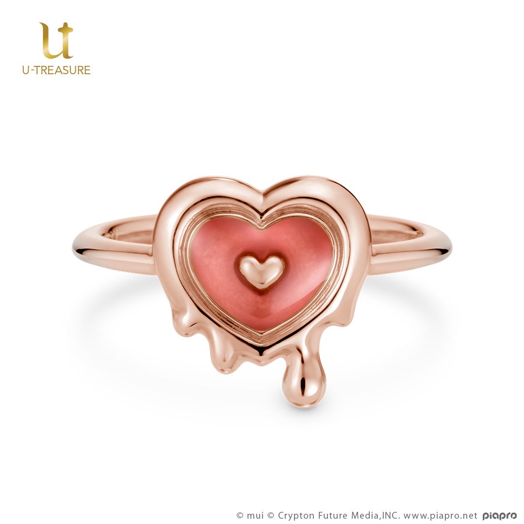 このたびの新作は、ピノキオピー様の人気楽曲「魔法少女とチョコレゐト」をモチーフにしたリング(指輪)です。とけるチョコとハートの中にハートが入った可愛らしいデザインで、ピンクゴールドコーティングとピンクの樹脂を使用し、甘い味がしそうな仕上がりです。