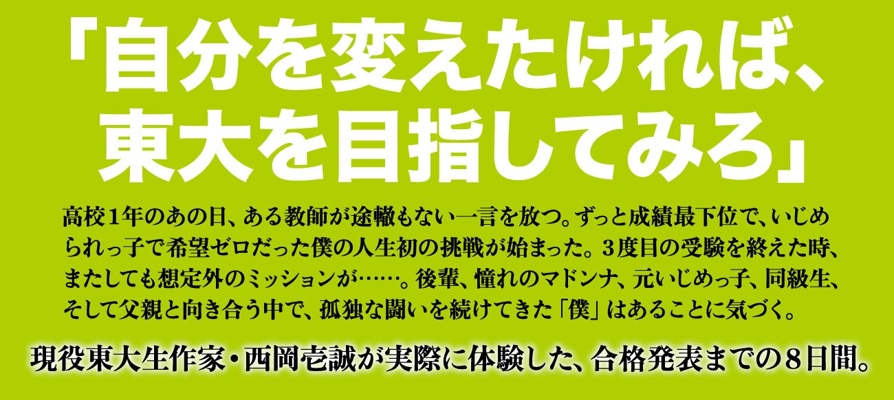 高校1年のあの日、ずっと落ちこぼれだった僕は、ある教師の一言で途轍もない挑戦を強いられた。「自分を変えたければ、東大を目指してみろ」。結局2浪、3度目の受験を終えた時、その教師がまた想定外のことを言い出して……。後輩、憧れのマドンナ、元いじめっ子、同級生、恩人、そして父親と向き合う中で、孤独な闘いを続けてきた主人公の「僕」はあることに気づく。現役東大生作家・西岡壱誠が実際に体験した、合格発表までの8日間。