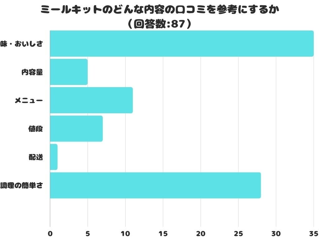 ミールキットのどんな内容の口コミを参考にするかをアンケートにて調査したところ、1位は「味・おいしさ」でした。