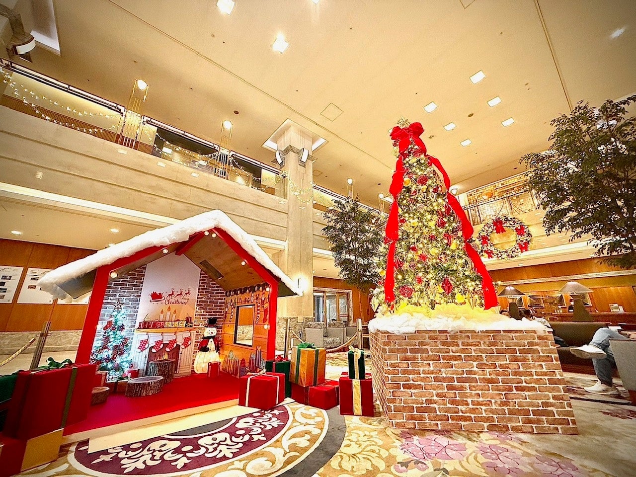 今年のクリスマス装飾では、赤とゴールドを基調とした高さ4mのクリスマスツリーと、サンタクロースの家をイメージしたフォトスポットがロビーに登場しました。