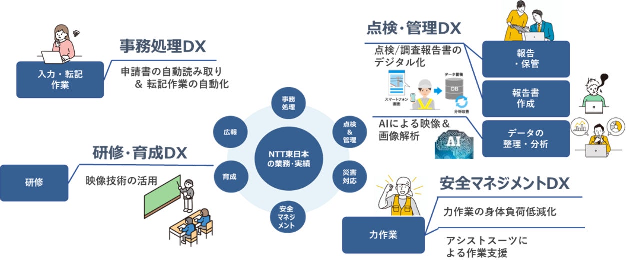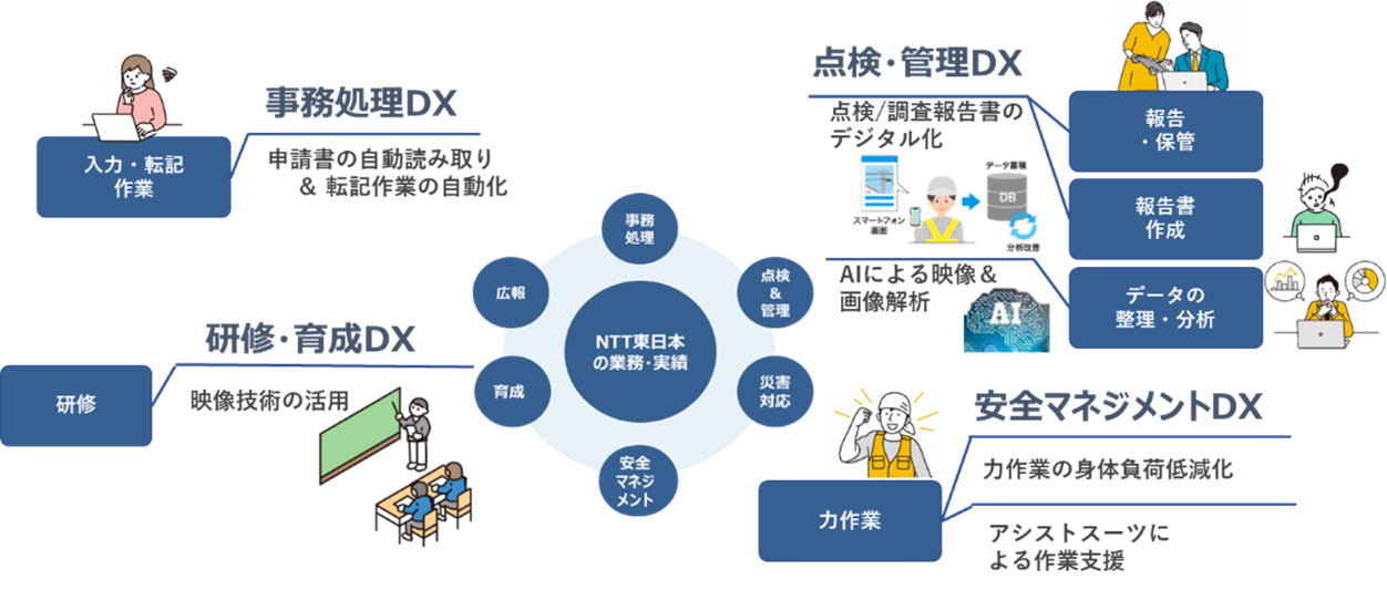 RPA・OCR、ドローン×映像、点検調査報告ツール、AI、アシストスーツ