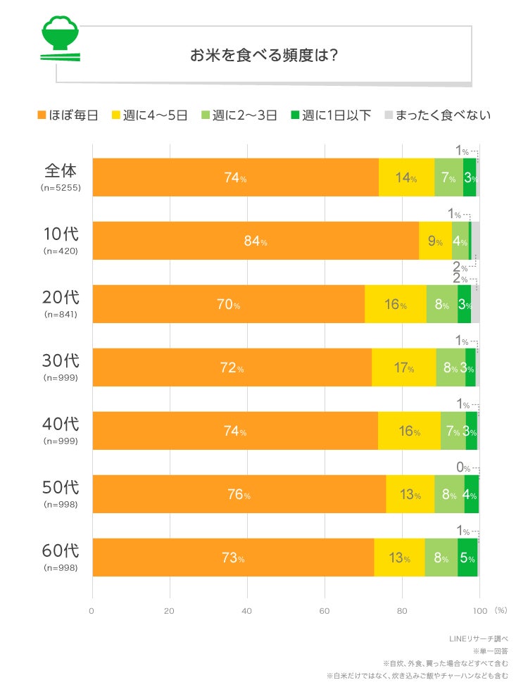 「LINEリサーチ」では、全国の10〜60代の男女を対象に、お米を食べる頻度や、自宅でお米を食べるときの方法について調査しましたので、その結果をお知らせします。
