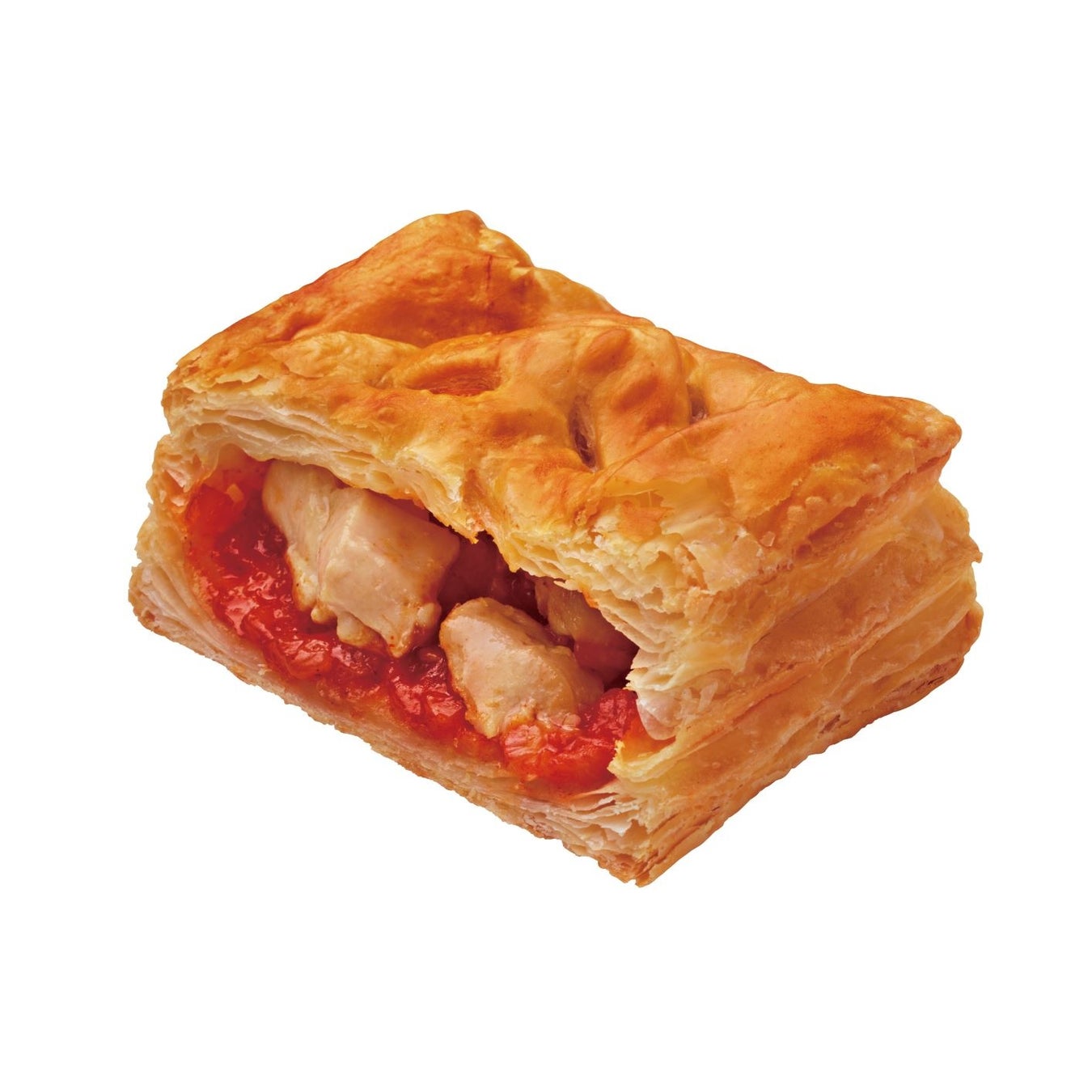 ゴロッとしたチキンにチリソースを合わせ、サクサクのパイ生地に包んで焼き上げました。