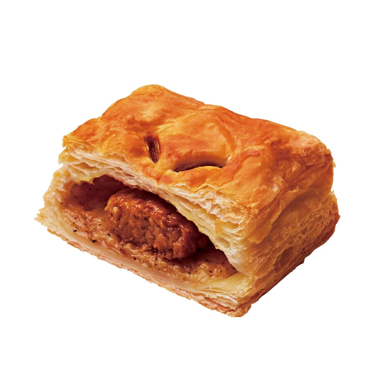 ゴロッとしたハンバーグに、てりやきソースとペッパー入りマヨを合わせ、サクサクのパイ生地で包んで焼き上げました。