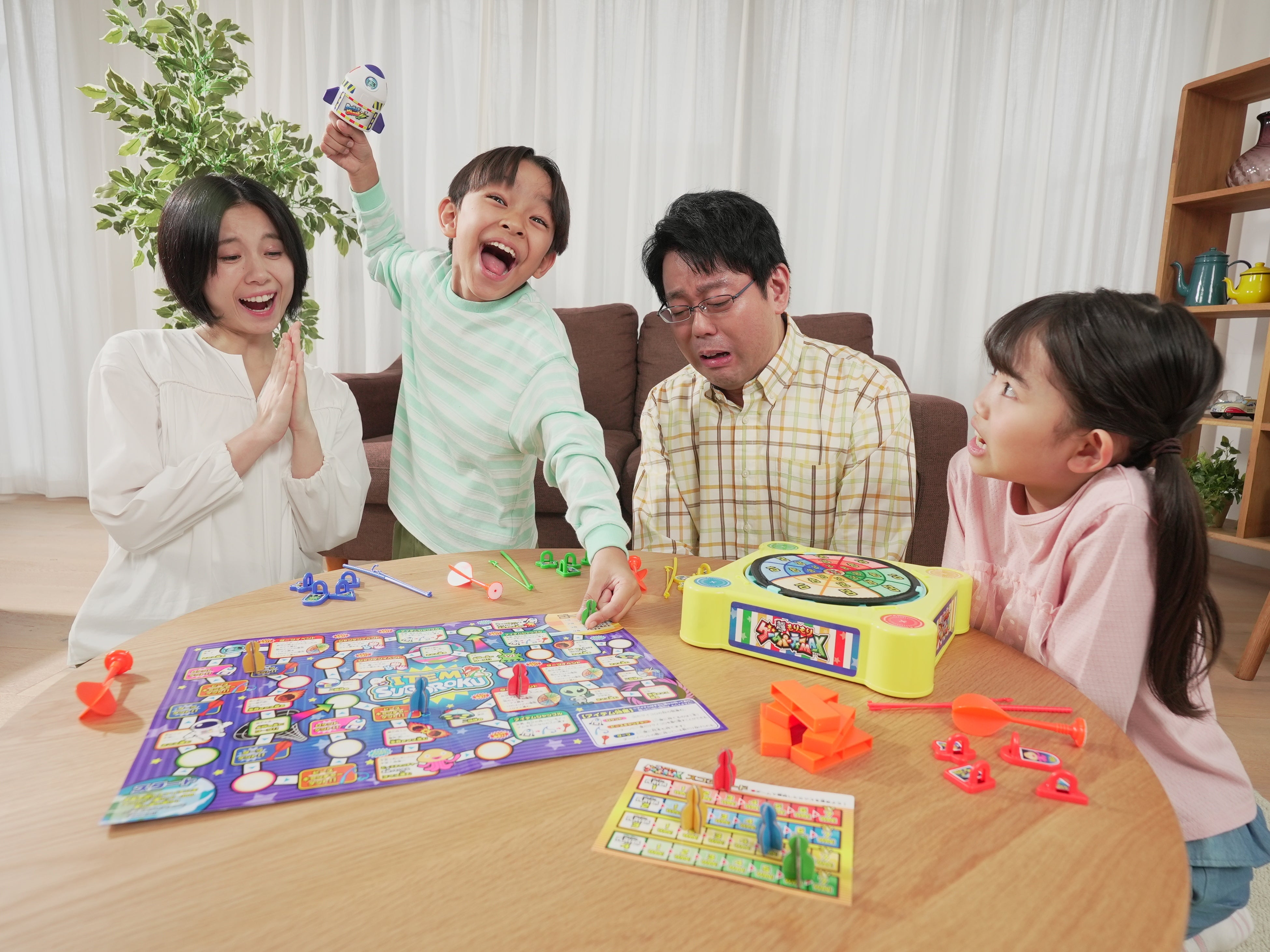 バランスゲームやダーツなど、お馴染みのわかりやすいルールながらも、本体が回転することで今までに無い感覚が味わえます。回転するスピードも2パターンあり、ゲーム中BGMも流れさらに盛り上がります。超もりもりのゲームで友達同士や家族で、子供から大人まで皆さんでお楽しみ下さい。