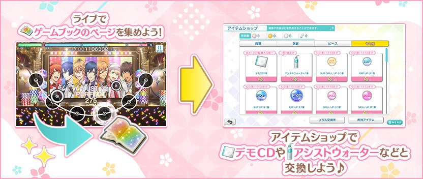 ライブで集めた「ゲームブックのページ」は、アイテムショップで様々なアイテムと交換できます。