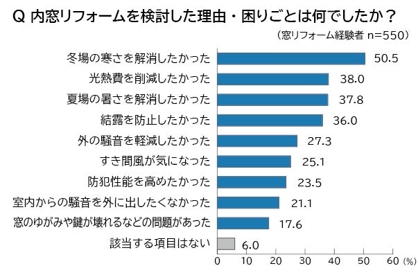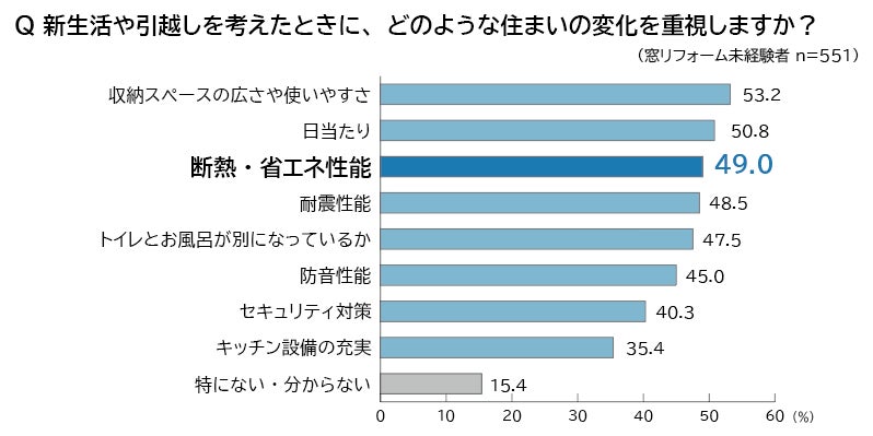 「住まいに関するアンケート」を窓リフォーム経験者と未経験者1,101名に実施 窓リフォーム未経験者の約49%が、新生活や引越しの際に「断熱・省エネ性能」を重視