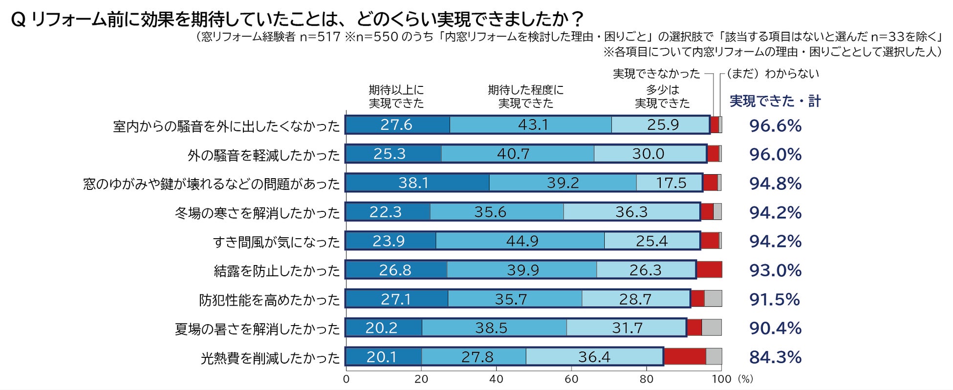 調査結果⑤:窓リフォーム経験者の81%が満足していると回答!期待した効果のほぼ全てを実感