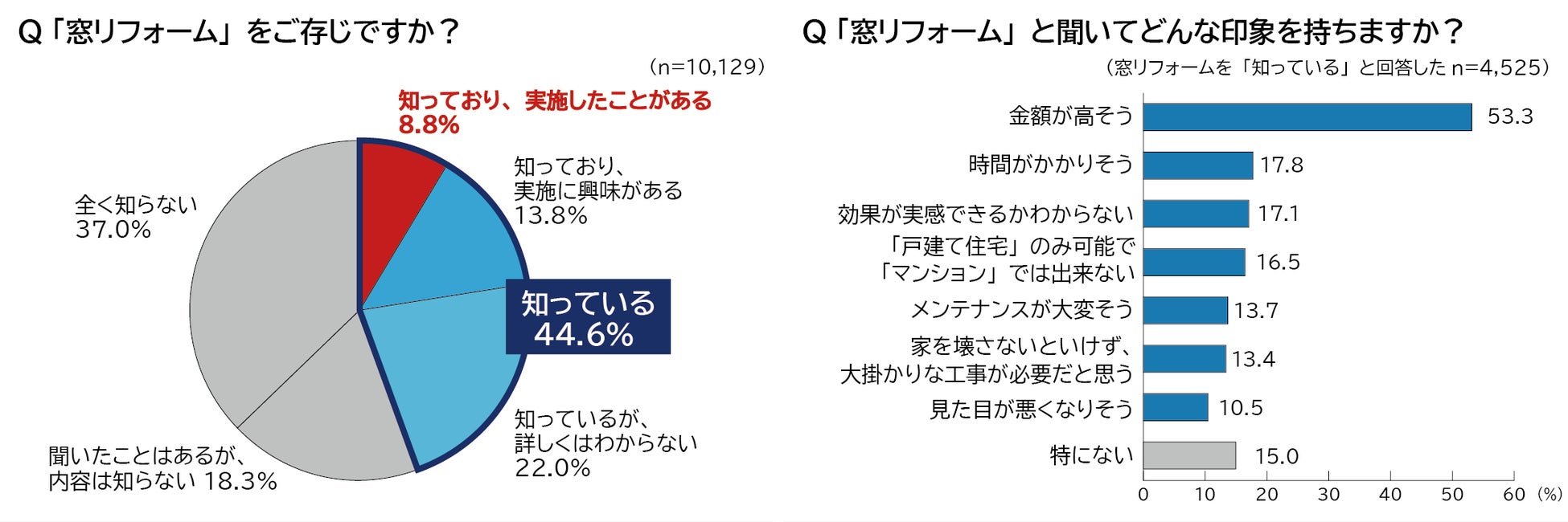 10,129人を対象にした事前のスクリーニング調査によると、44.6%と半数近くの人が窓リフォームについて「知っている」と回答しましたが、実施したことがある人はわずか8.8%でした。