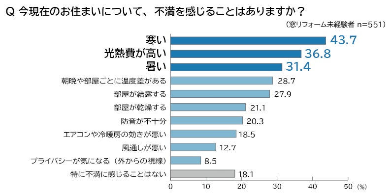 窓リフォーム未経験者に、現在の住まいで不満を感じることを調査したところ、1位「寒い(43.7%)」、2位「光熱費が高い(36.8%)」、3位「暑い(31.4%)」という結果に。「朝晩や部屋ごとに温度差がある(28.7%)」や「部屋が結露する(27.9%)」といった不満も上位にあがり、一年を通して住まいの温熱環境に起因する不満を感じていることがうかがえます。