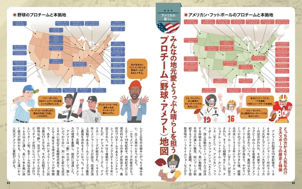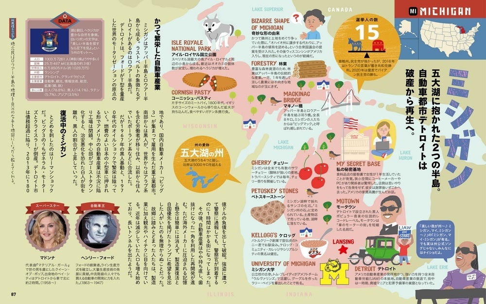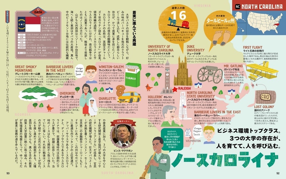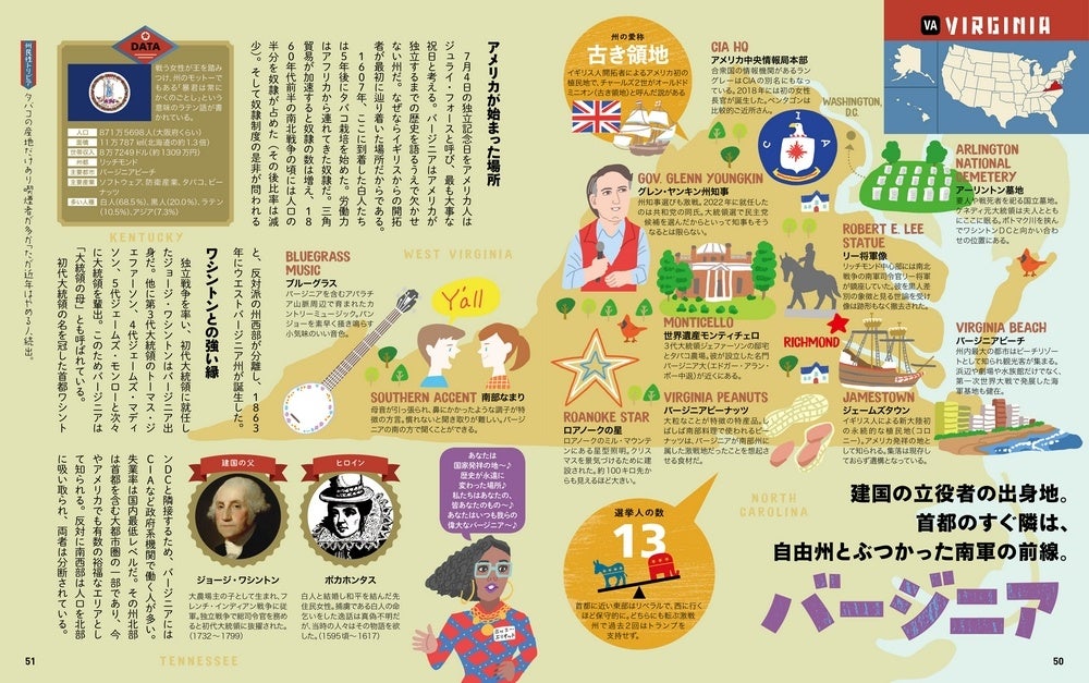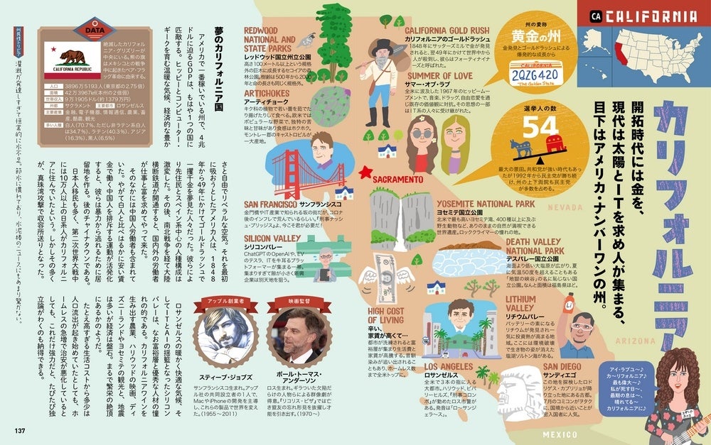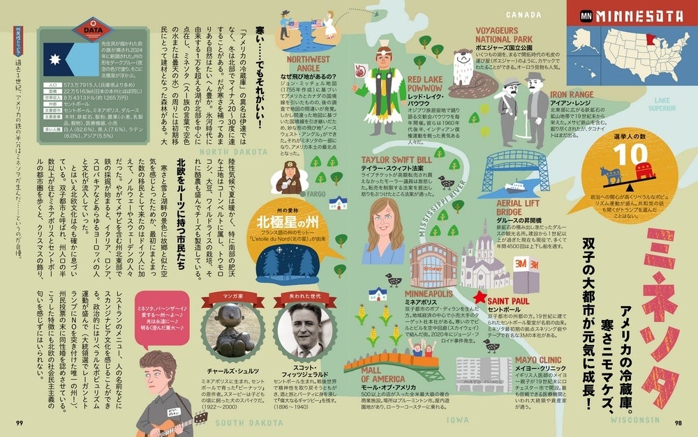 本書最大の特長は、50州全州を見開き単位で図解しているページです。地図でスッとシリーズでおなじみの親しみやすいイラストマップの上にトピックスや著名人の情報がちりばめられたフォーマットはリラックスタイムにパラっと読むのに最適なテイストに仕上げられています。