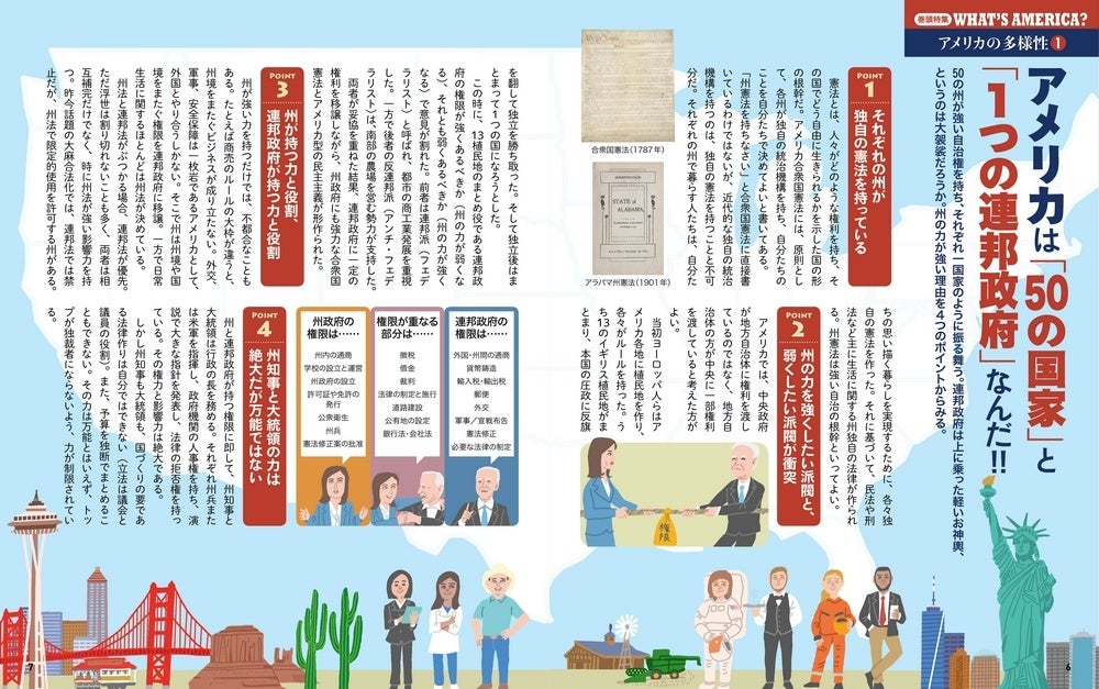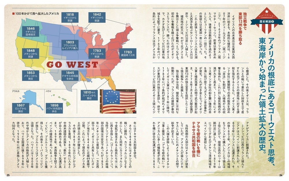 今回は歴史解説ページも充実。国の成り立ちから領土拡大、南北戦争、公民権運動、2大政党制、そして銃規制問題まで、アメリカ史もスッと頭に入ります。