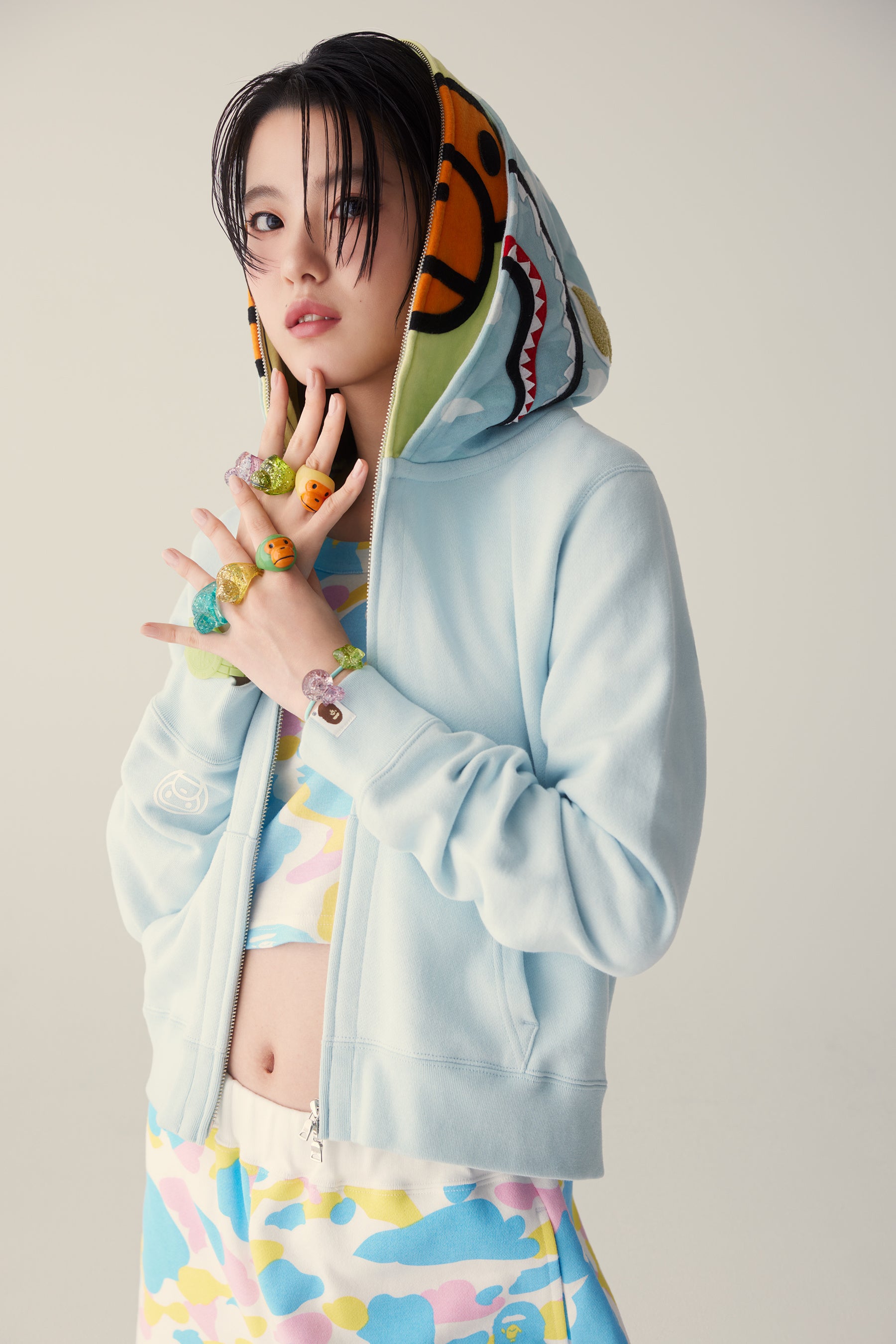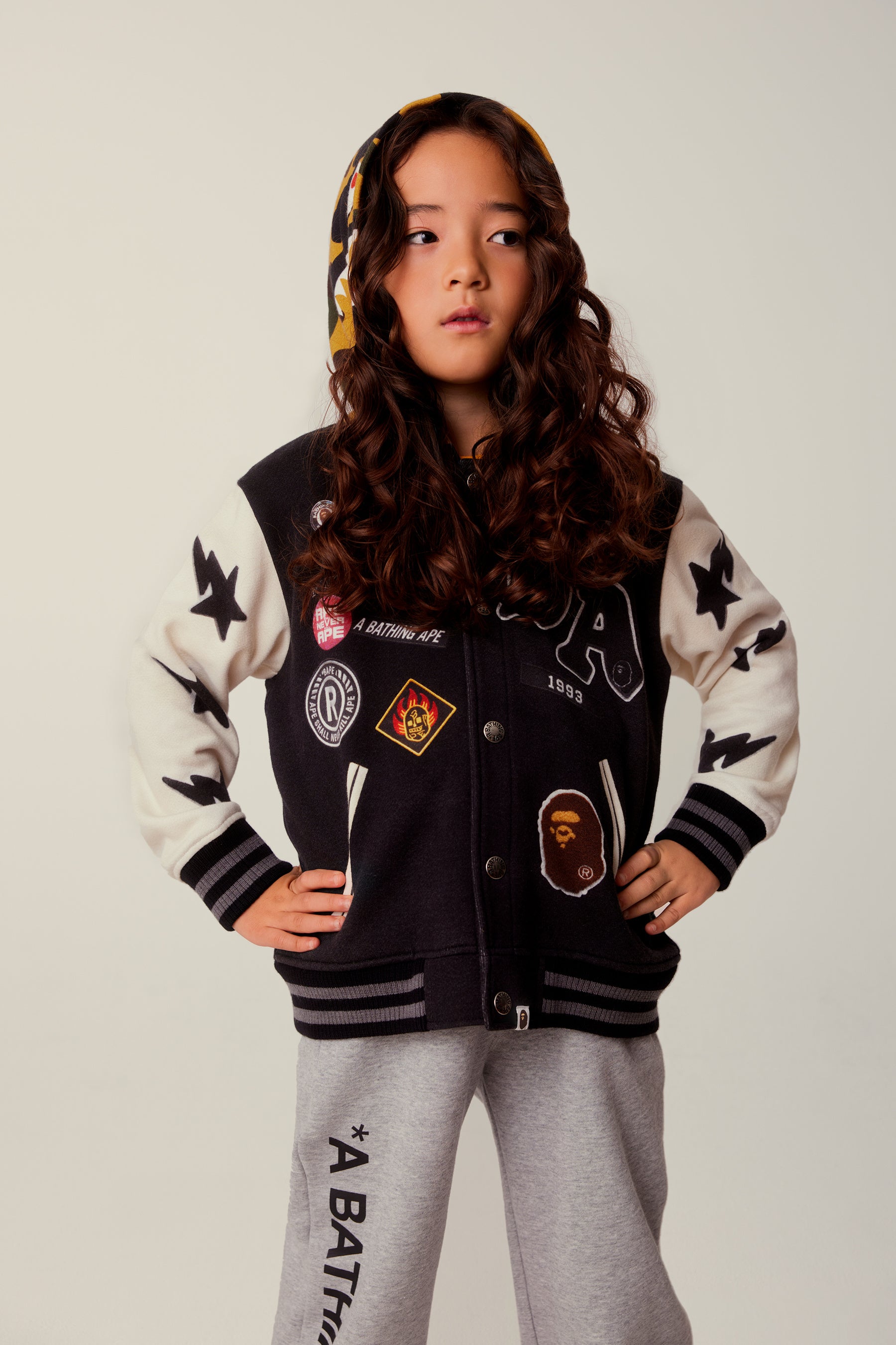 さらに、ワッペンやバッジを重ねたフェイクプリントのパッチワークシャツやバーシティジャケットも登場。BAPE®のヘリテージを感じさせる、自由で表現力豊かなスタイルを提案します。