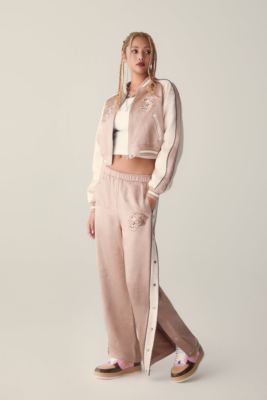 クロップド丈やタイトなシルエット、ルーズラインソックスが大胆なスポーティさを加え、パステルカラーやCOLOR CAMOのミックスが、MA-1やフーディ、ワンピースを遊び心あるステートメントアイテムへと昇華させます。