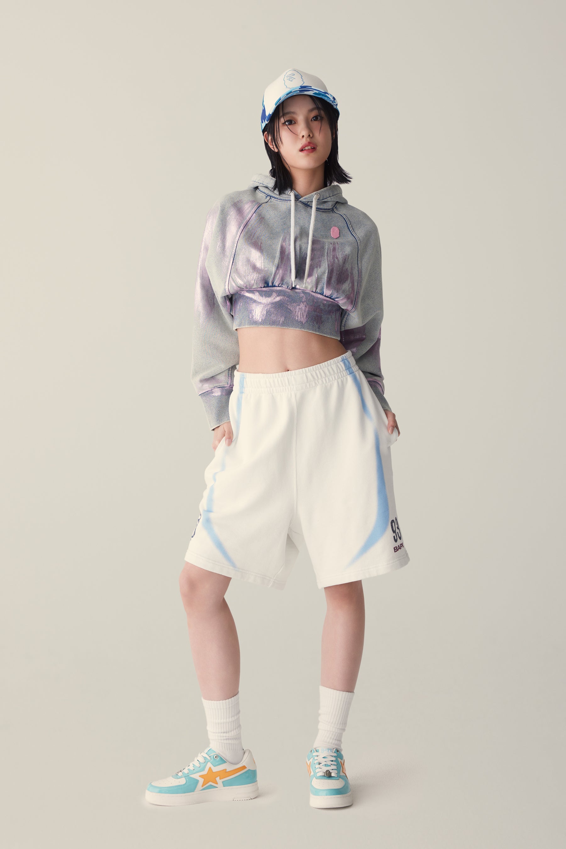 箔プリントを施したインディゴフーディは、メタリックな輝きを纏い、カジュアルウェアを大胆なステートメントへと昇華させます。これらのピースは、伝統を尊重しながらも、BAPE®を象徴する恐れを知らないクリエイティビティを体現しています。