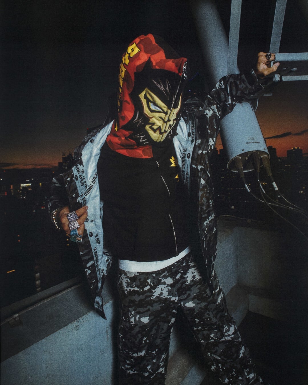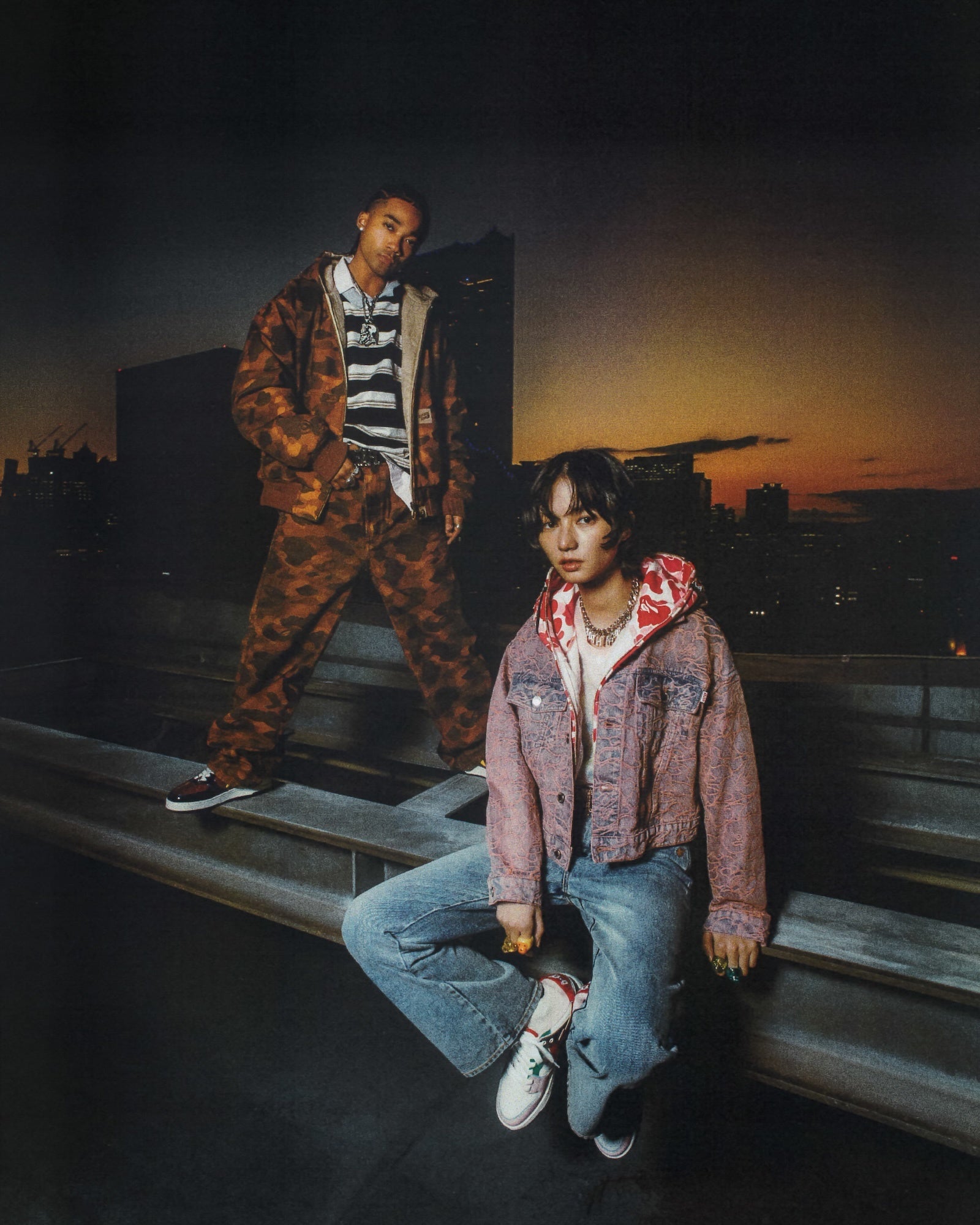 SS26キャンペーンは、時間とカルチャーを巡る旅。 音楽、スポーツ、アートの分野から集結した才能たちが、3つの象徴的な舞台を通してストーリーを紡ぎます。活気に満ちたストリート、日本のヴィンテージハウス、そして東京のスカイラインを望むルーフトップ。キャンペーンの中心には、BAPE®を象徴するグラフィックやカモ柄、アーカイブビジュアルを映し出すTVセットのインスタレーションを配置しました。