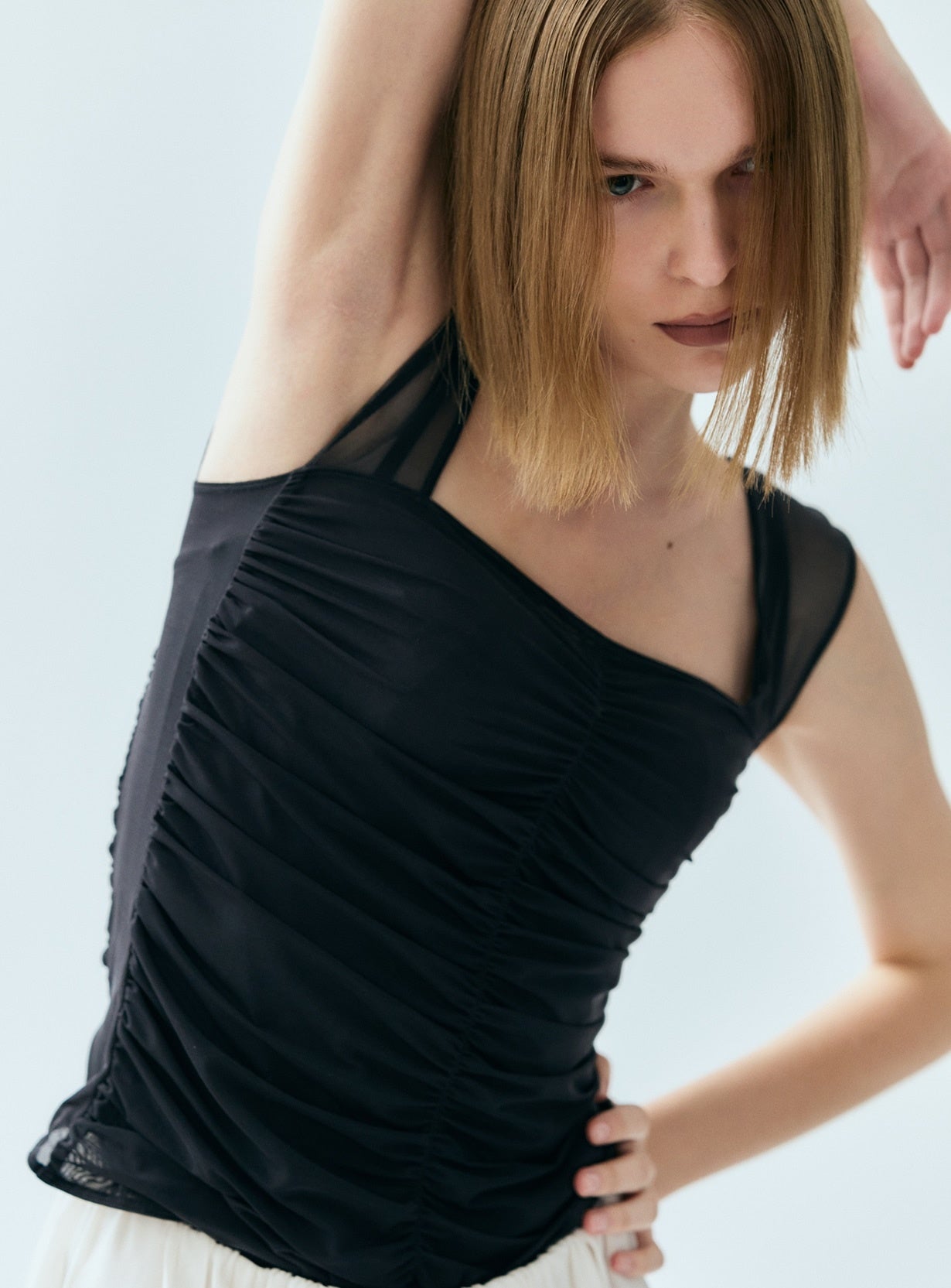 6枚接ぎの立体パターン設計を採用したカップ付きインナーは適度な補整力があり、動きやすく快適な着用感も魅力です。シアー素材のトップスとのセットデザインで、単体でも着用可能。ストラップは着脱式で、スタイリングに合わせたアレンジが楽しめます。