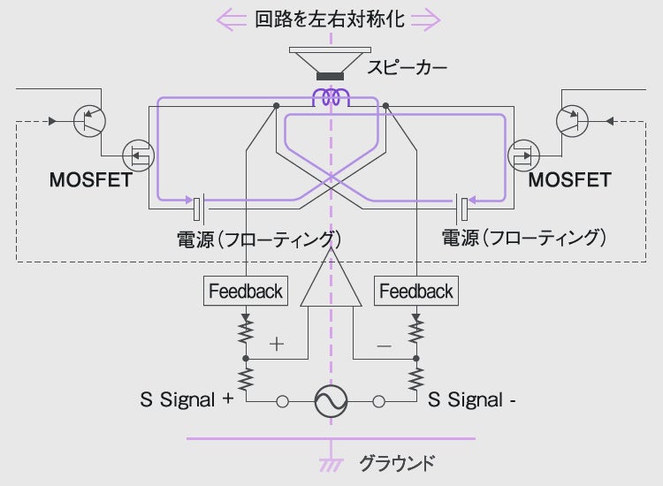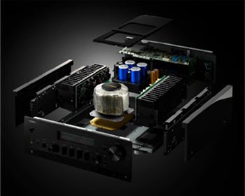 ヤマハが誇る独創のアンプ技術「フローティング&バランス・パワーアンプ」を搭載しました。出力段の左右チャンネルそれぞれの+側と-側、計4組の電力増幅回路をフローティングし、出力段におけるプッシュプル動作の完全対称化(プル−プル化)を可能にするとともに、電源供給を含む全回路をグラウンドから完全に独立させ、微細な電圧変動やグラウンドを巡る外来ノイズの影響も徹底的に排除しました。さらに出力素子には同一極性のMOS-FETを採用することによりスピーカーの駆動能力を高め、躍動感あふれる圧倒的な音の表現を可能にしています。